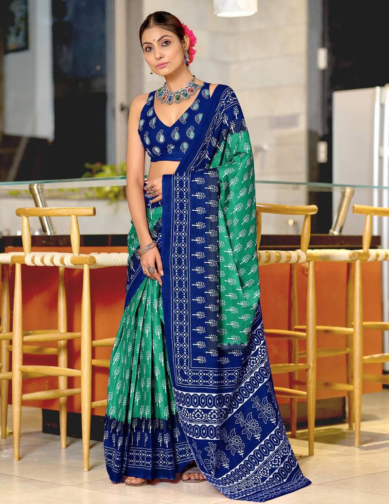 Product Description | Green Soft Cotton Printed Fancy Saree With Blouse |
