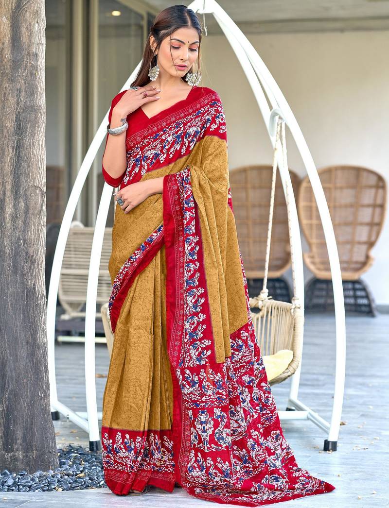 Product Description | Mustard Soft Cotton Printed Fancy Saree With Blouse |