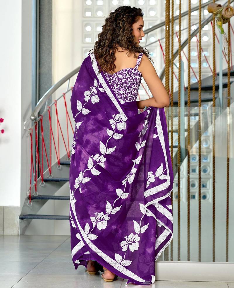 Product Description | Purple Mulmul Cotton Printed Fancy Saree With Blouse |