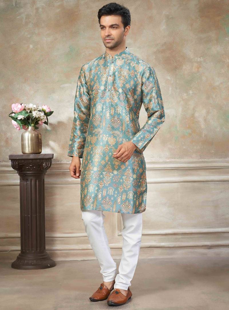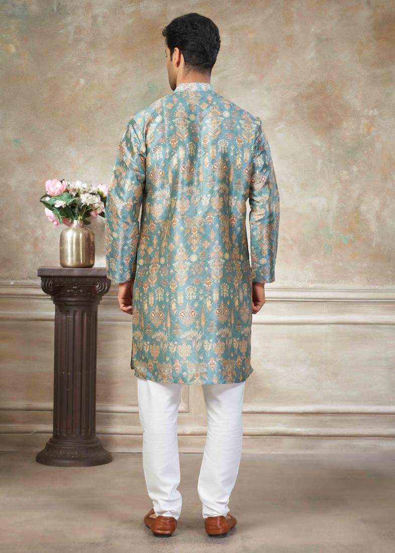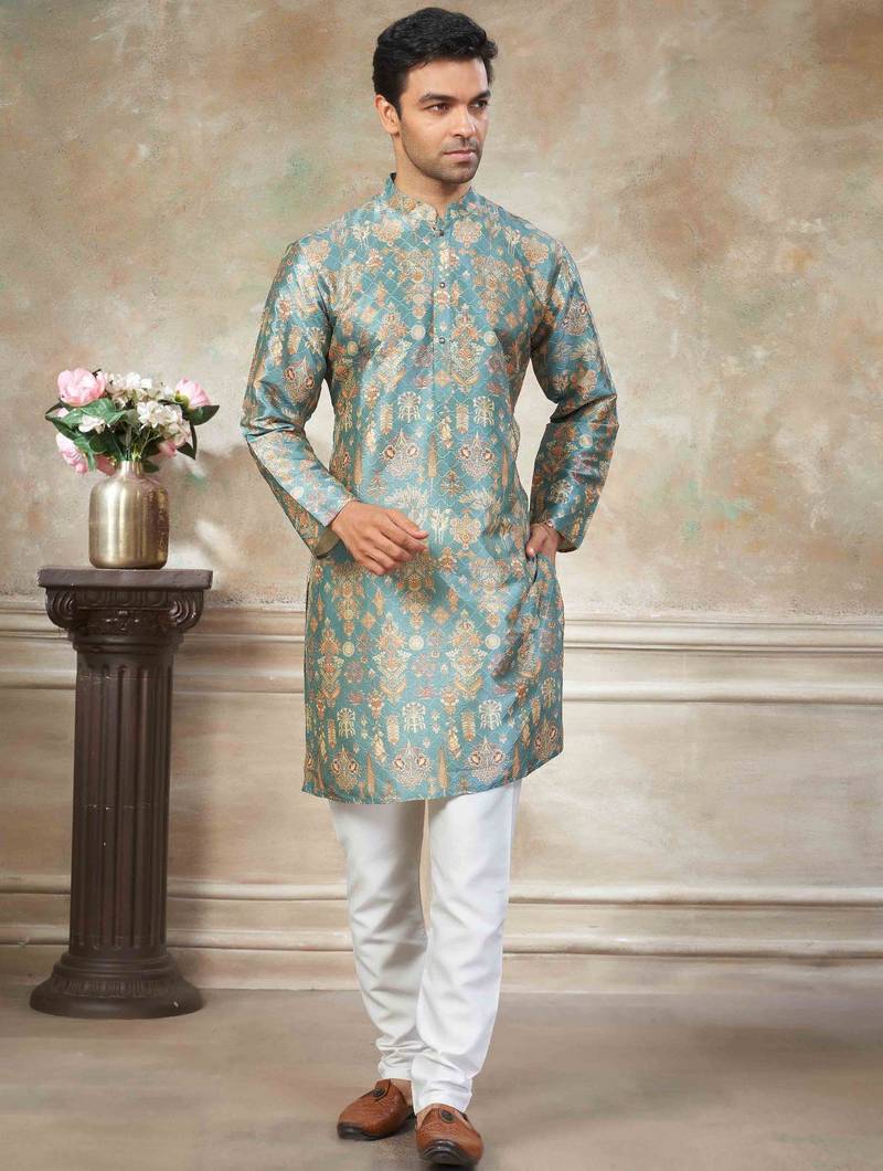 Teal colour premium silk digital print kurta pajama menswear collection