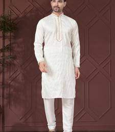 White pure silk with embroidery work kurta pyjama for mens wear