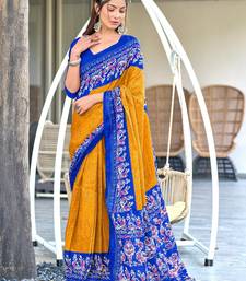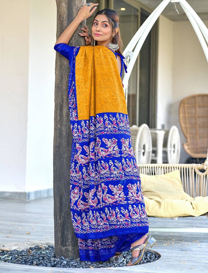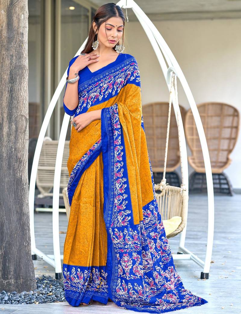 Product Description | Yellow Soft Cotton Printed Fancy Saree With Blouse |