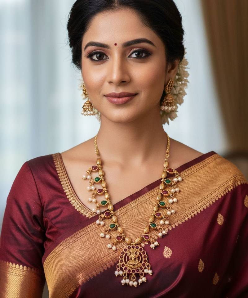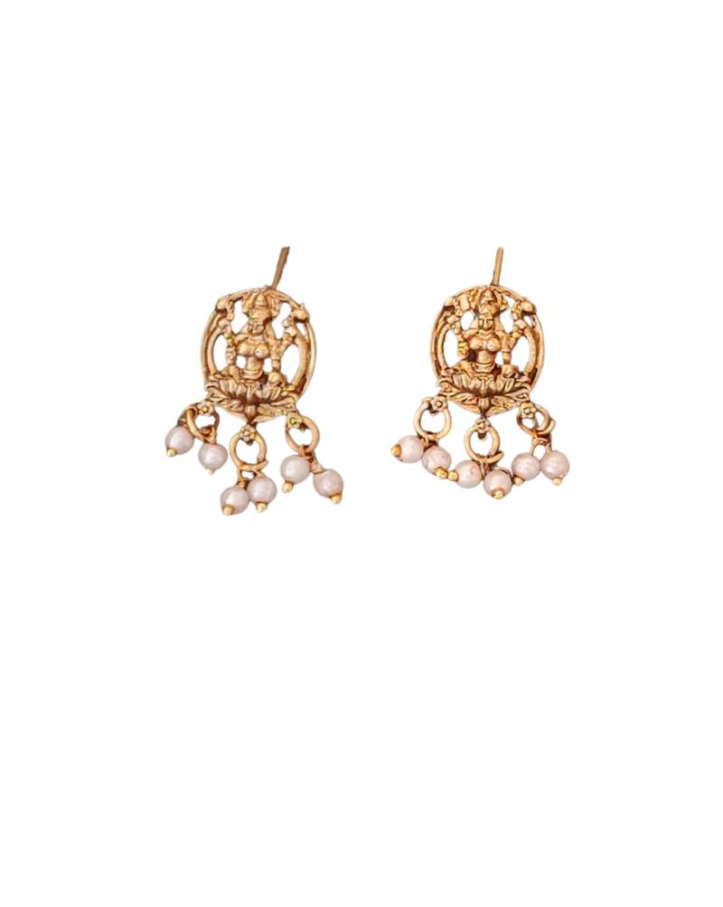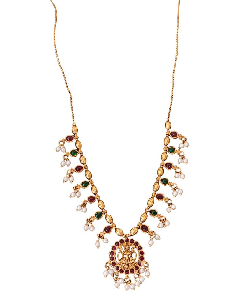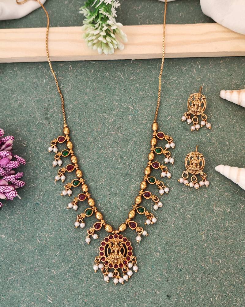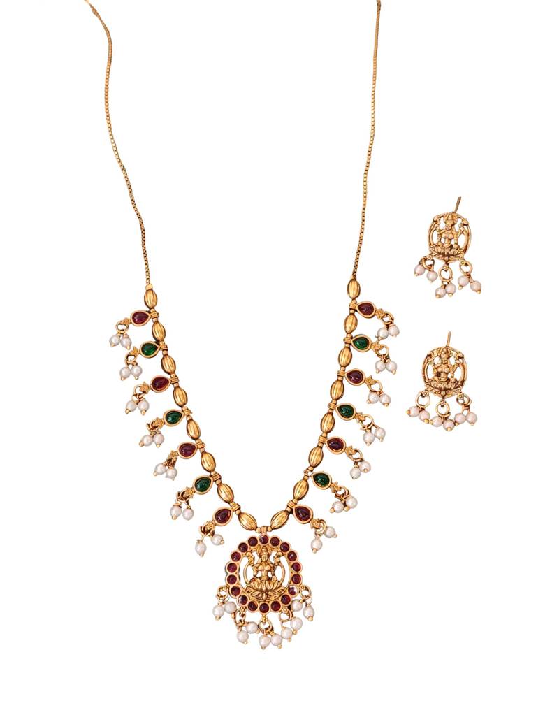 | Product Description | Enhance Your Traditional Look With This Elegant Antique Lakshmi Temple Necklace Set, Beautifully Crafted With Red And Green Stones And Delicate Pearl Drops. The Necklace Features A Detailed Lakshmi Pendant Symbolizing Prosperity, Paired With Matching Earrings For A Complete Festive Appeal. Designed With A Rich Antique Gold Finish |