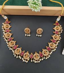 | Product Description | This Stunning Temple Necklace Set Features Lakshmi Coin Motifs, Ruby Stones, And Pearl Drops. Paired With Matching Earrings, It Adds A Rich Traditional Charm, Perfect For Weddings, Festivals, And Cultural Celebrations |