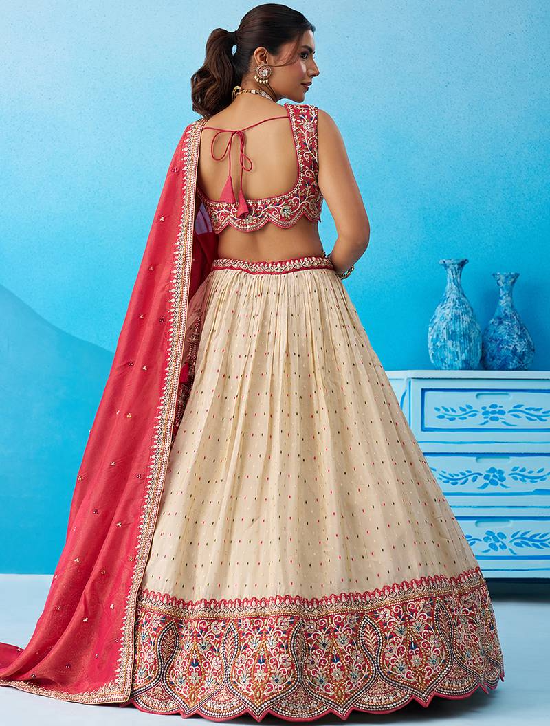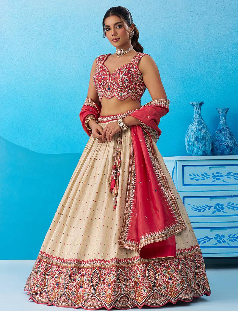 | Product Description | "• Lehenga : Elegant Semi Stitched Lehenga Set Crafted In Premium Cream Jacquard Tissue Fabric With Moti, Heavy Sequins And Coding Work . The Lehenga Features A 4.2 Meter Flair With A Cutwork Border On The Hemline And Is Supported With Double Shantoon Inner, Can Can 12 & 18 Inches And Buckram For A Perfect Shape.
