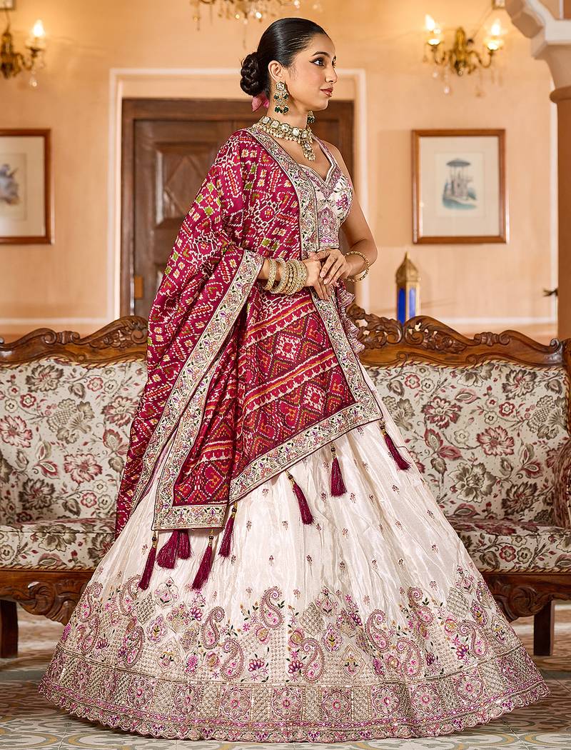 Cream tissue fabric sequins embroidery semi stitched lehenga & unstitched blouse with maroon color dupatta
