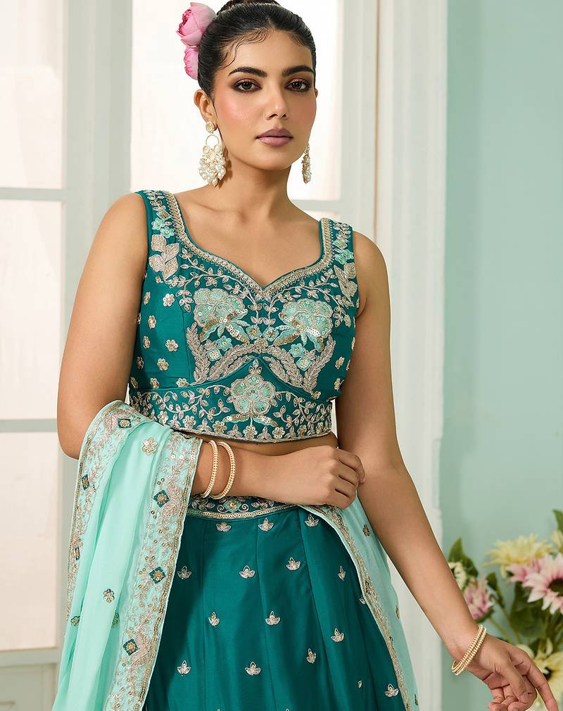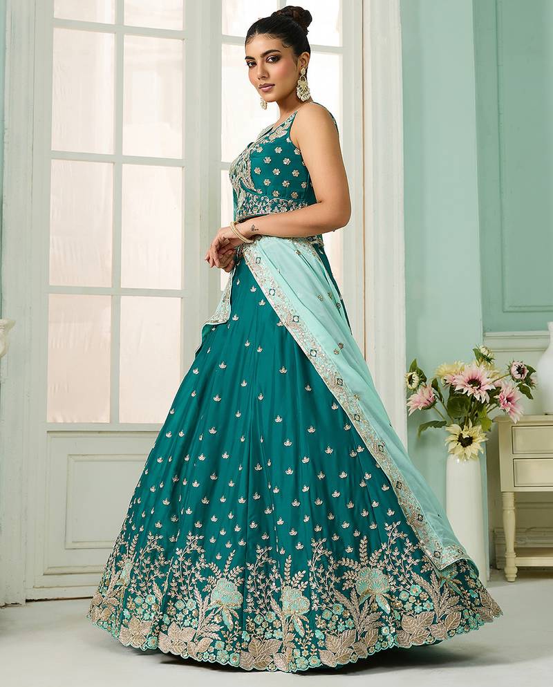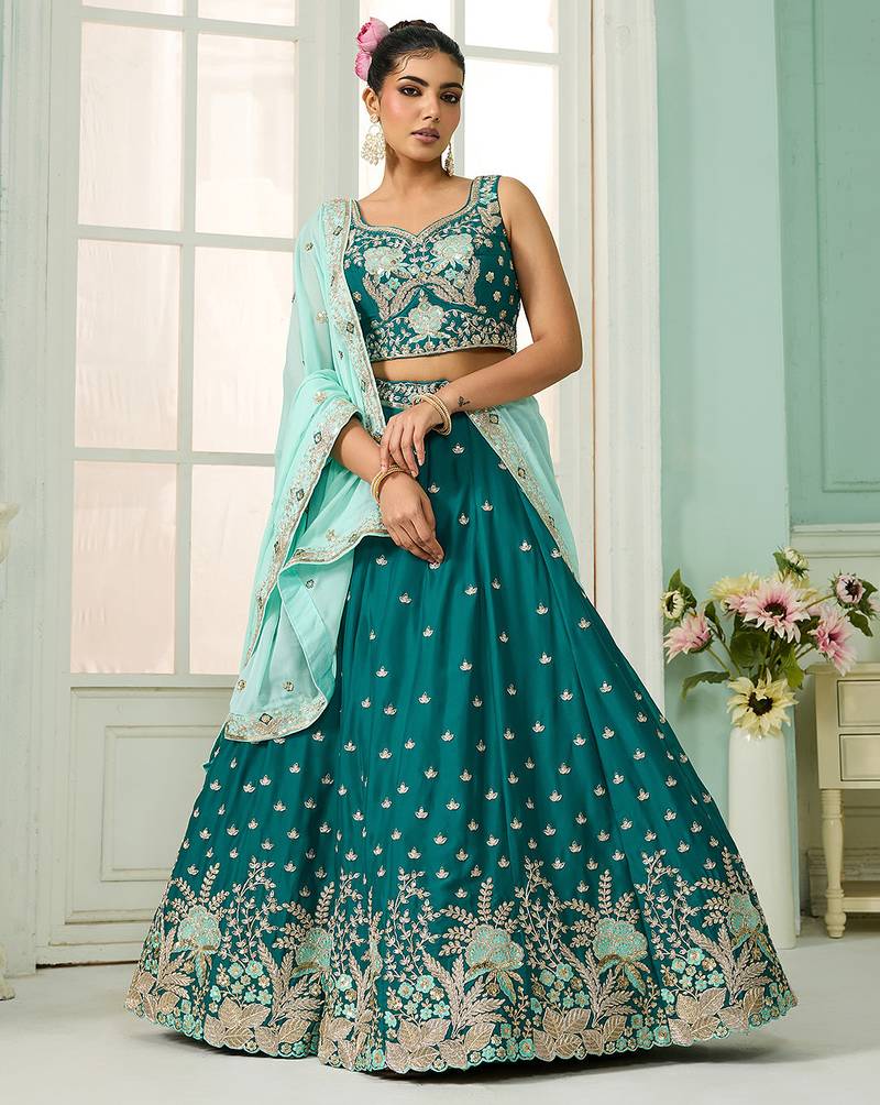 Product Description | • Lehenga: Made Of Premium Quality Green Color With Georgette Fabric Full Flaire Semi Stitched Lehenga With Sequins And Stone And Coding Work Has A Thread Embroidery Work. Has A Thread Cutwork Border On The Hemline.