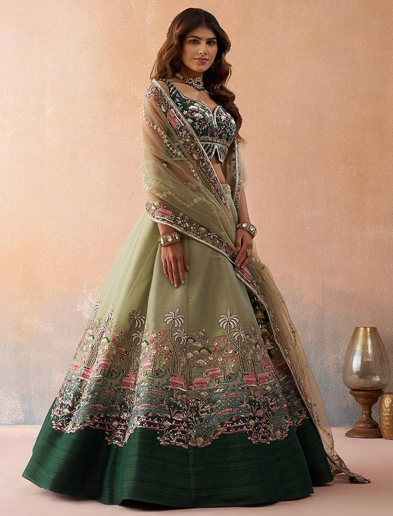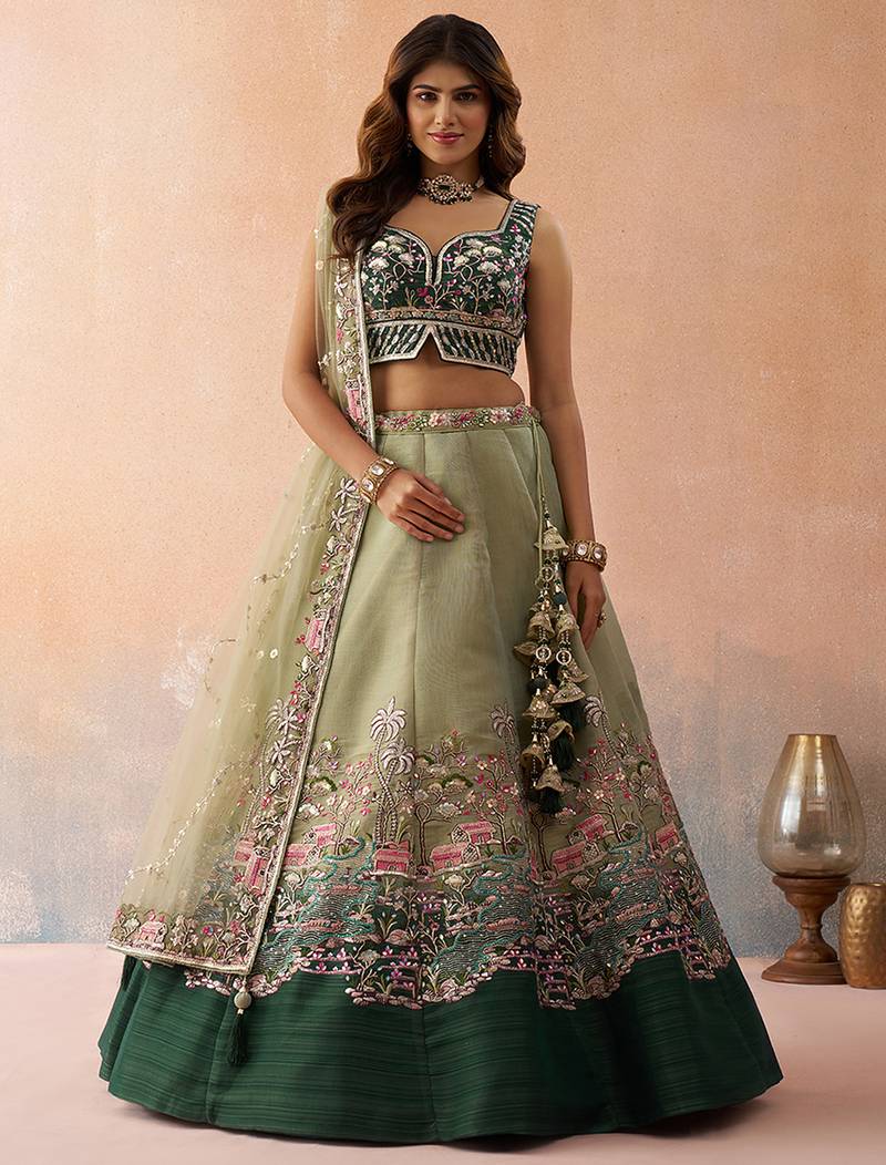 | Product Description | • Lehenga : Elegant Semi Stitched Lehenga Set Crafted In Premium Ombre Green And Limegreen Net Fabric With Zarkans, Heavy Sequins And Coding Work Has A Thread Embroidery Work. The Lehenga Features A 4.3 Meter Flair With A Colourful Heavy Border On The Hemline And Is Supported With Double Shantoon Inner, Can Can 12 & 18 Inches And Buckram 4 And 12 Inches For A Perfect Shape.
