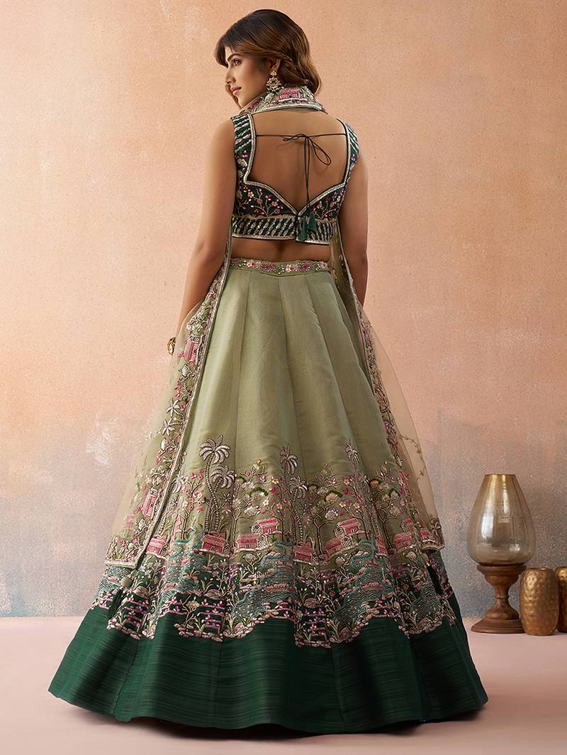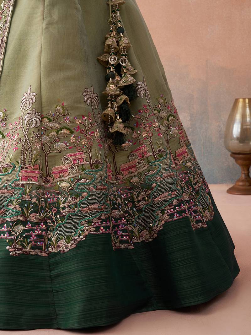 Green- net sequins embroidered omber green and limegreen semi-stitched lehenga choli & dupatta