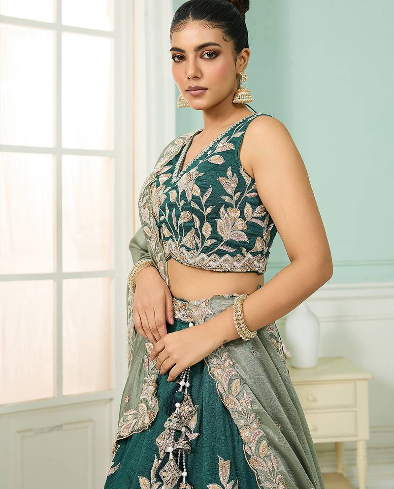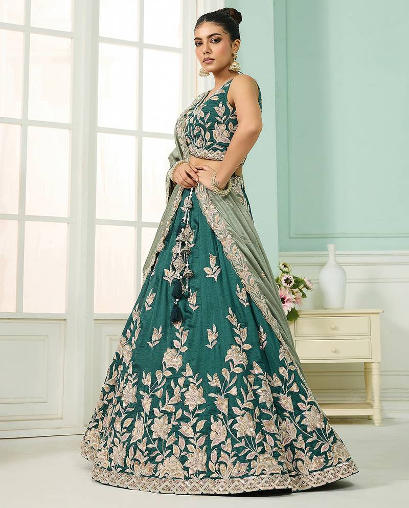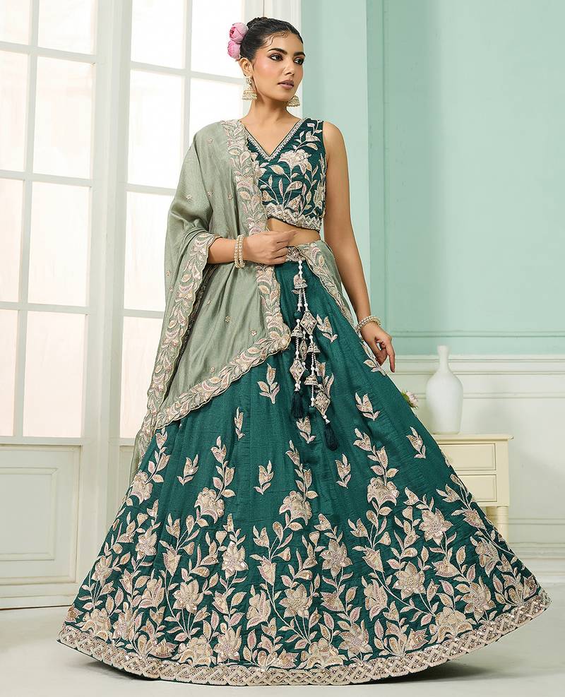 Product Description | • Lehenga: Made Of Premium Quality Green Color With Silk Fabric Full Flaire Semi Stitched Lehenga With Breads And Stone And Coding Work Has A Thread Embroidery Work. Has A Thread Cutwork Border On The Hemline.