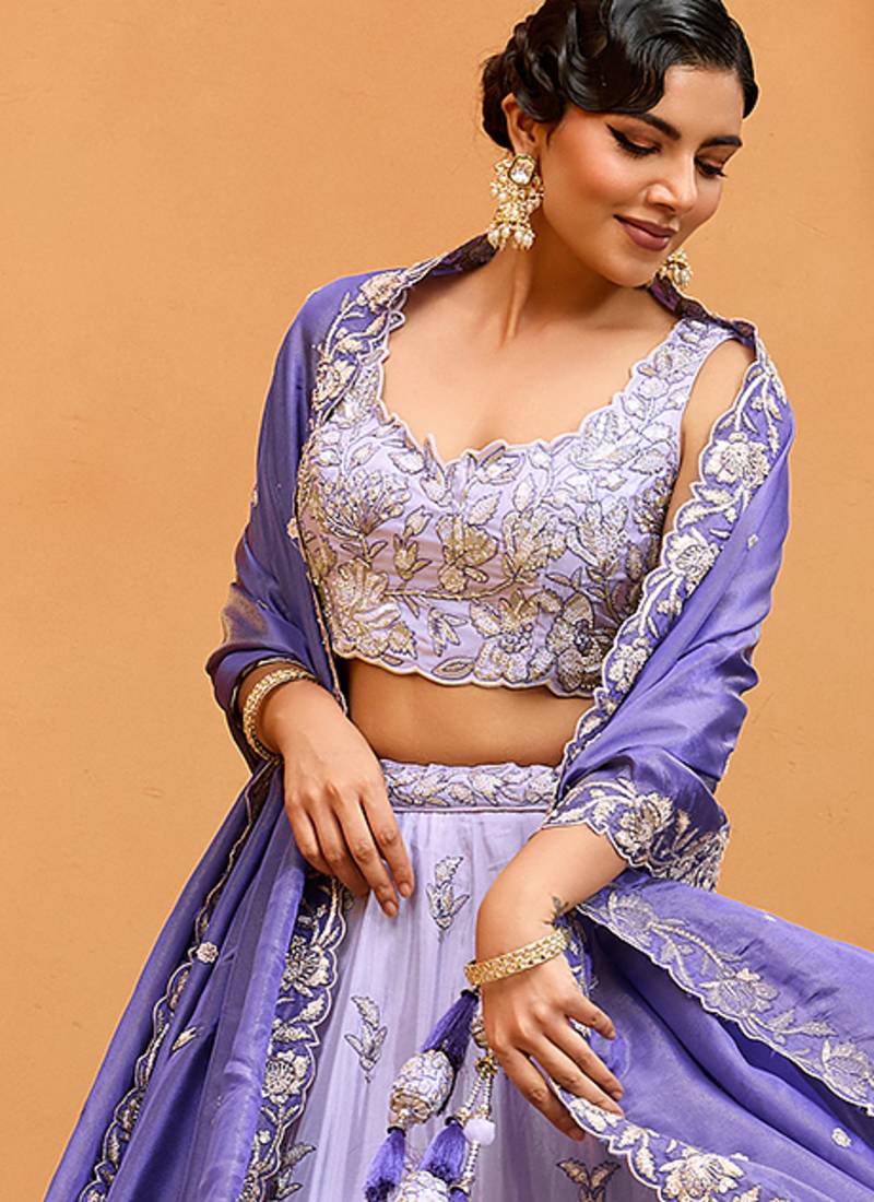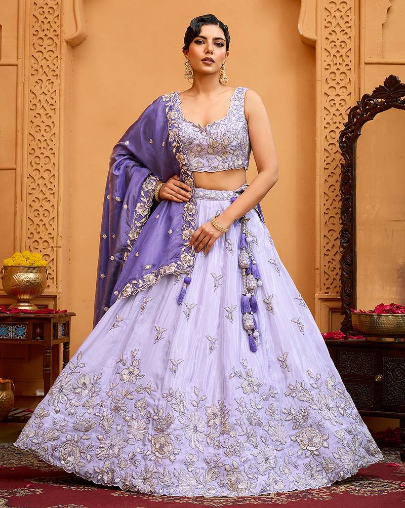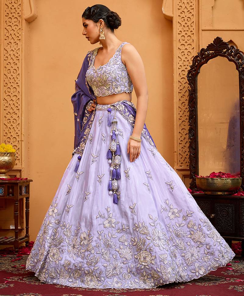 Product Description | • Lehenga: Made Of Premium Quality Lavender Color With Tissue Fabric Full Flaire Semi Stitched Lehenga With Beads And Stone And Coding Work Has A Thread Embroidery Work. Has A Thread Cutwork Border On The Hemline.