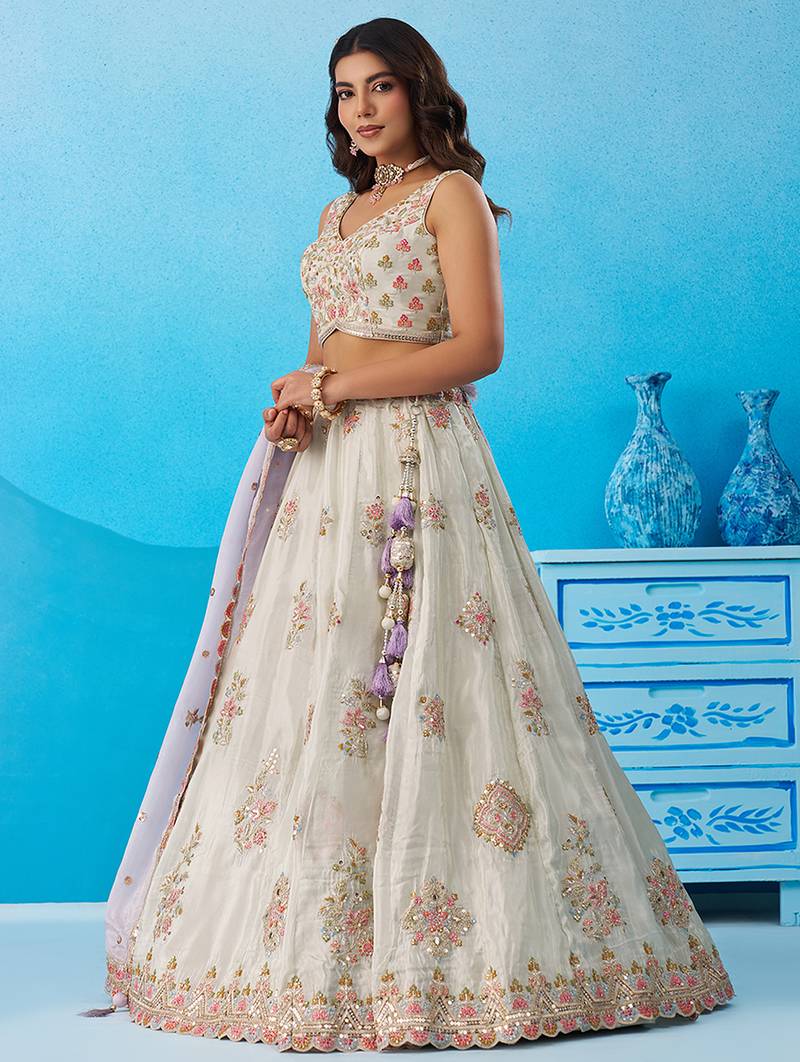 • Paired With A Mauve Tissue Fabric Dupatta Highlighted With Heavy Zari Embroidery And Beautiful Colours Cut Work Border With Tassels, This Set Is Ideal For Weddings And Festive Occasions.• Lehenga: Customizable Upto 42 Inches At The Waist,