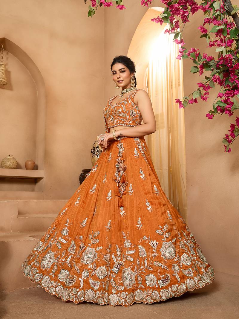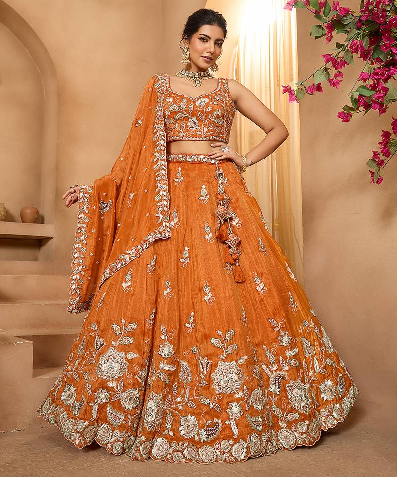 Product Description | • Lehenga: Made Of Premium Quality Orange Color With Tissue Fabric Full Flaire Semi Stitched Lehenga With Sequins And Stone And Coding Work Has A Thread Embroidery Work. Has A Thread Cutwork Border On The Hemline.