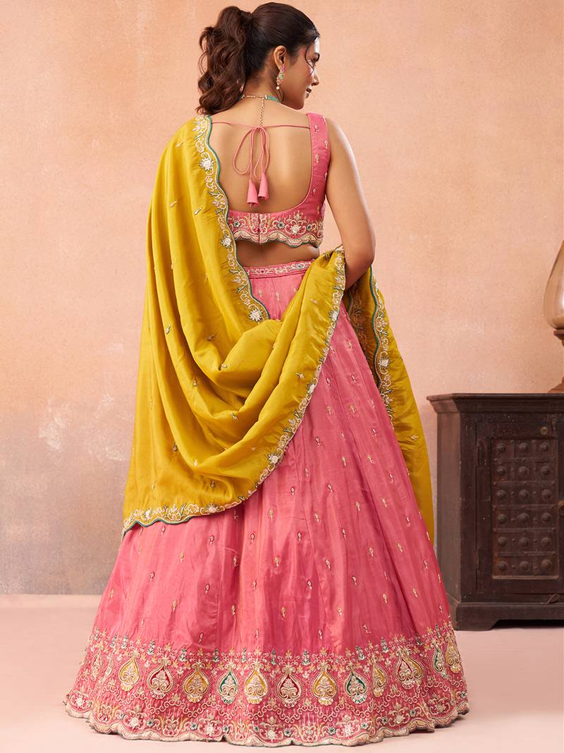 • Paired With A Mustard Cosmos Silk Dupatta Highlighted With Pink Thread And Embroidered Cutwork Border, This Set Is Ideal For Weddings And Festive Occasions.• Lehenga: Semi Stitched 40 Inches At The Waist,