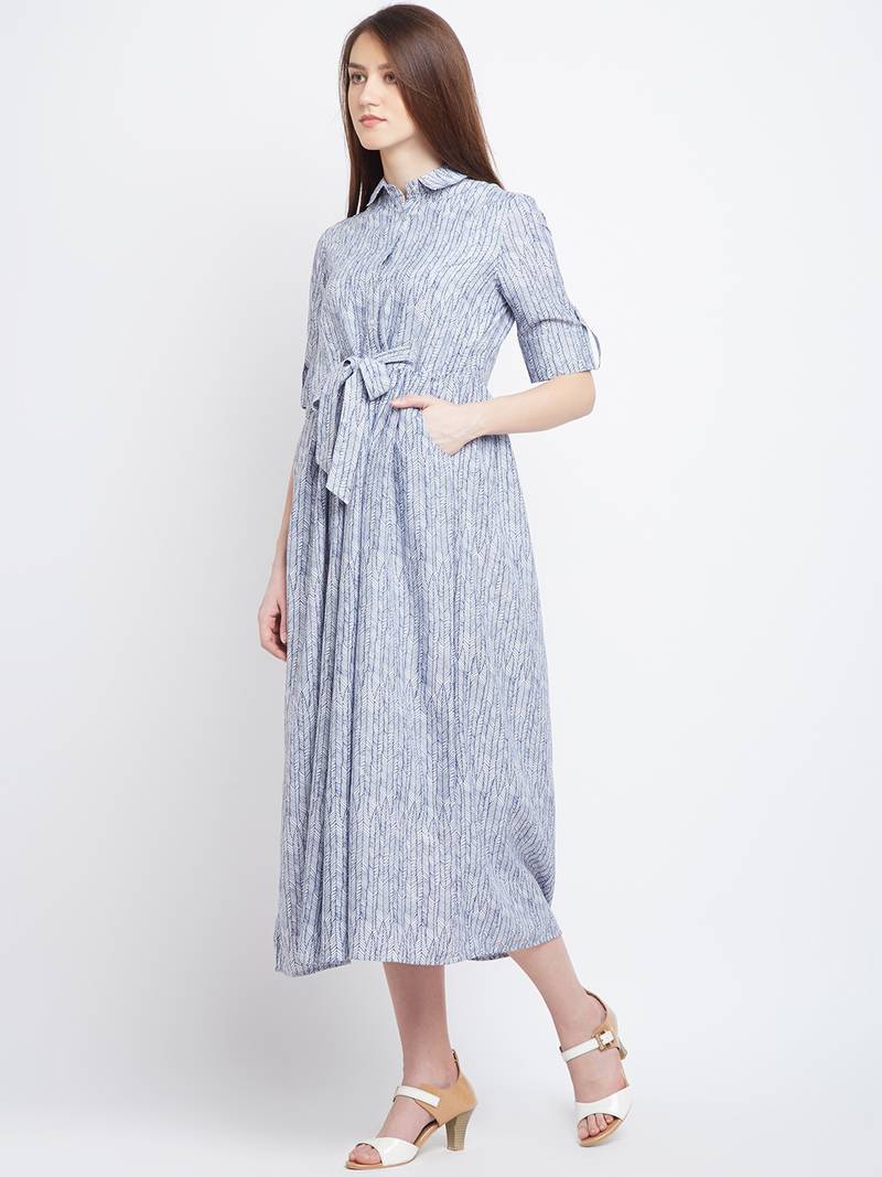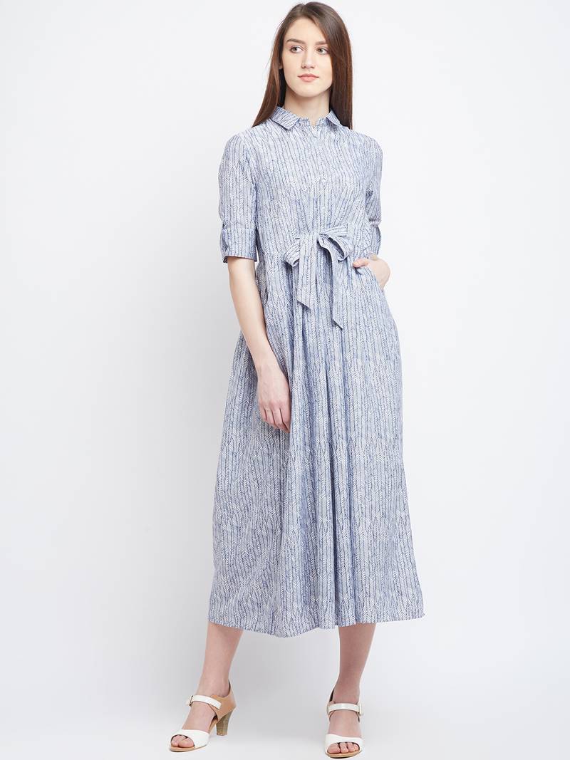 | Product Description | Blue And White Geometric Print, Loose Fitted, Mid Length Dress Has Collar Neck With Button Placket, Elbow Length Roll Up Sleeves And Tie Up Waist. |