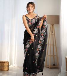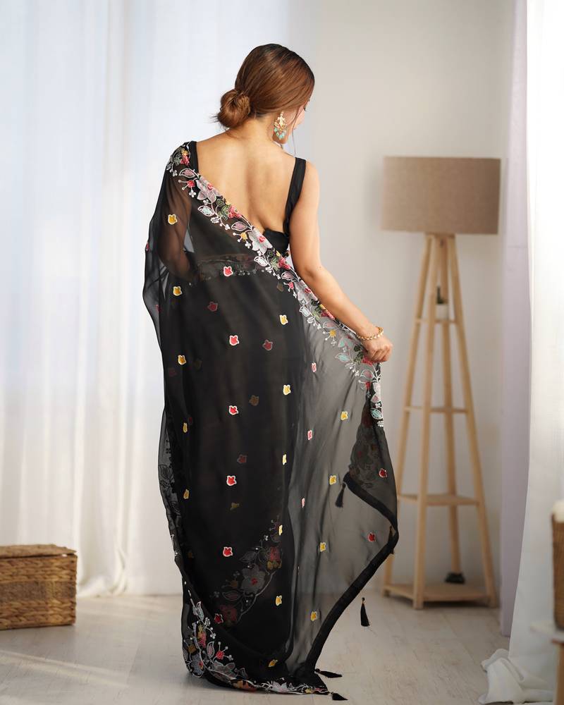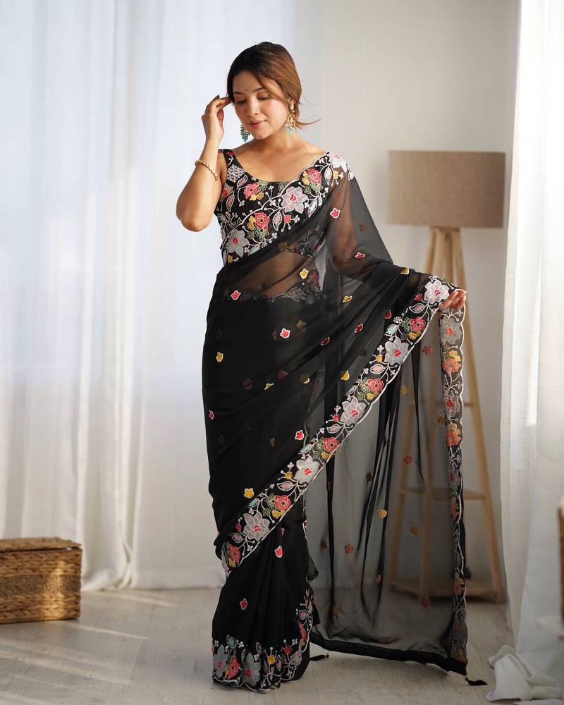 Black multy thread,sequance embroidery work georgette saree with blouse piece