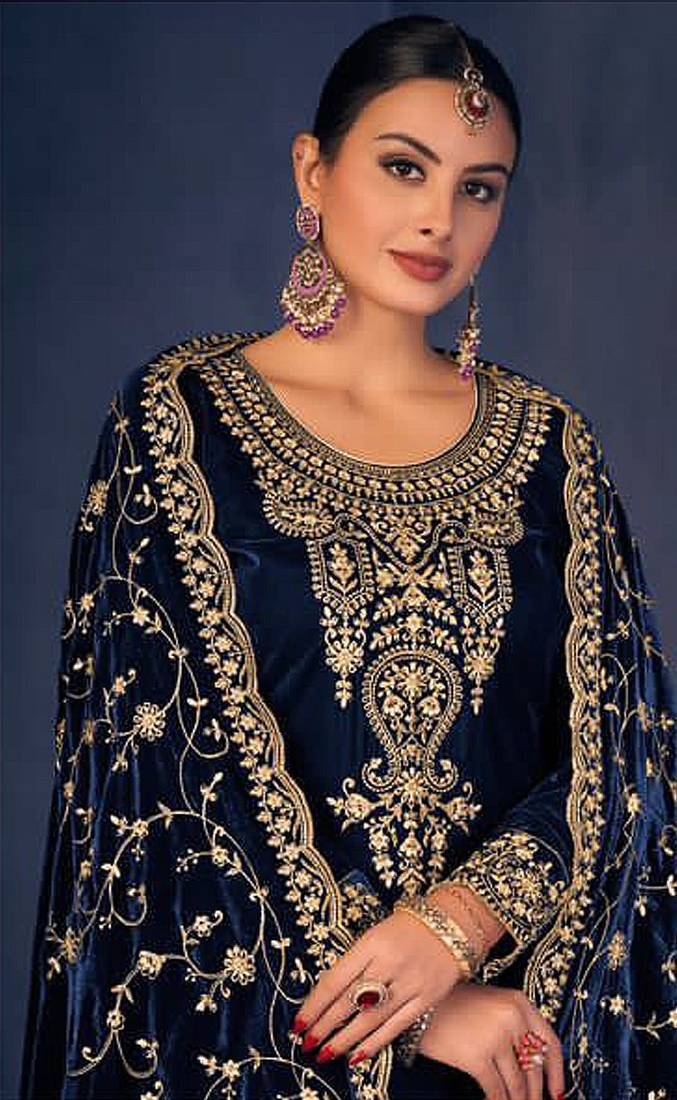 Blue heavy designer embroidery work velvet semistiched long length kameez plazzo party wear salwarsuit semi stitched
