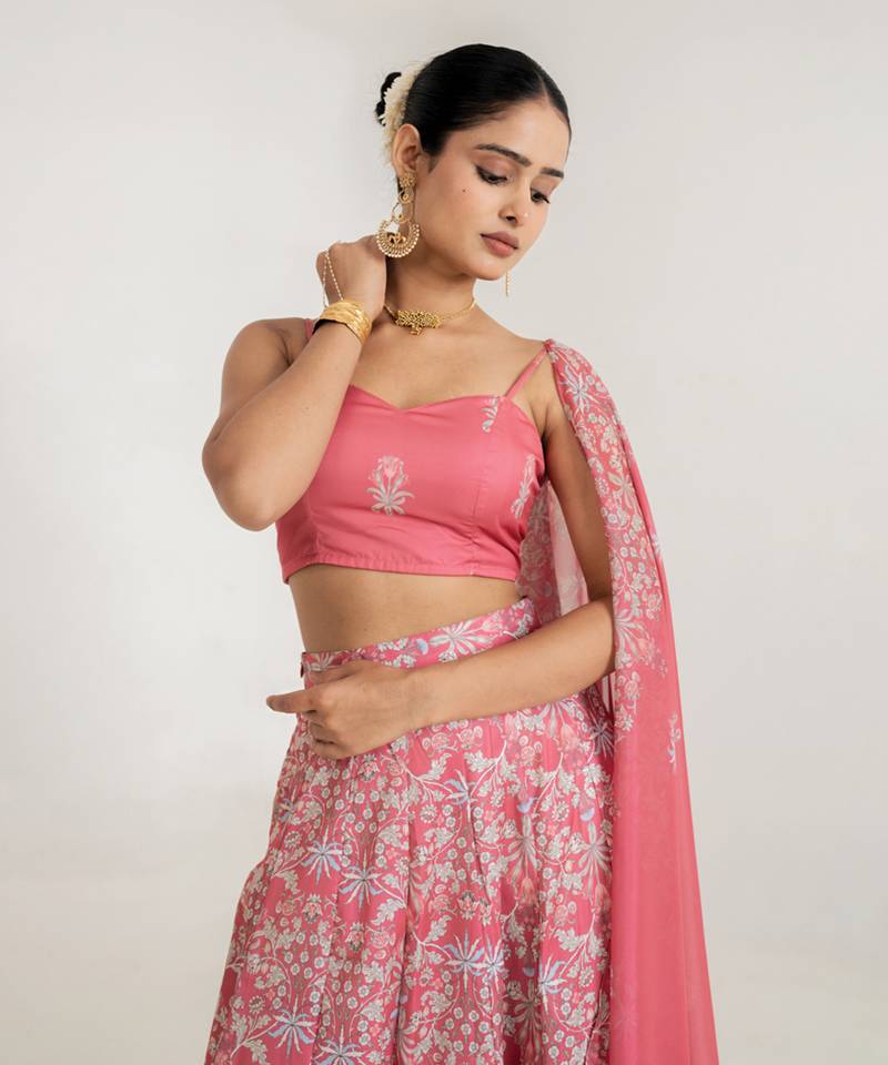 | Product Description | A Pink Swiss Satin Lehenga Set Made From Satin Fabric Features Floral Printed Detailing Across Lehenga And Blouse. The Set Includes A Line Lehenga, Sleeveless Choli With Sweetheart Neckline, And Pink Dupatta. The Inner Lining Uses Crepe Fabric For Comfort Support. The Lehenga Set Follows Printed Work Pattern With Coordinated Design Layout. The Fabric Provides Soft Sheen And Elegant Drape. The A Line Structure Enhances Silhouette Flow. The Blouse Includes Printed Styling With Fitted Finish. The Set Is Stitched And Designed For Festive Wear, Cultural Events, And Indo Western Traditional Gatherings |