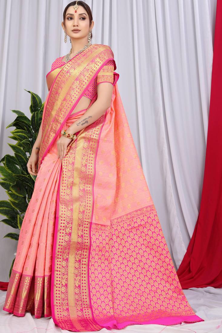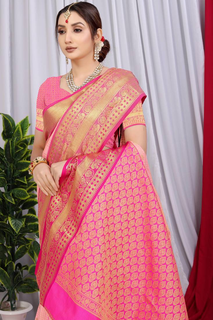 Pink pure heavy silk with gold zari kanchipuram indian luxury wedding premium paithani saree with blouse