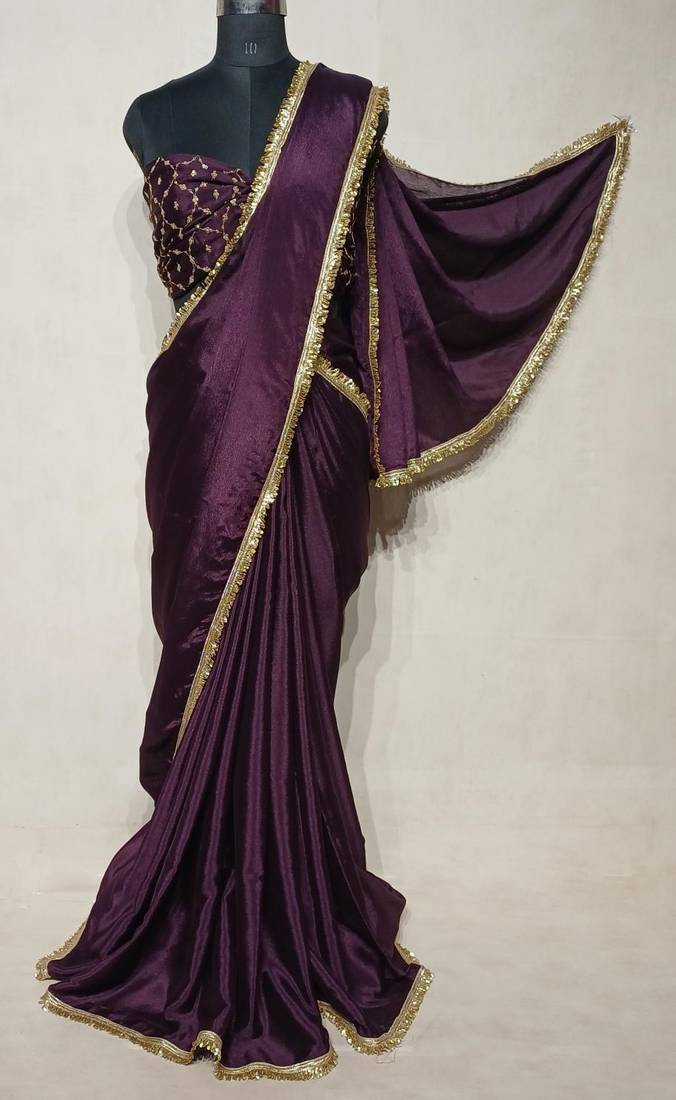Designer chinon saree decorated with readymade gold sequence lace and sequence embroidered unstitched blouse piece