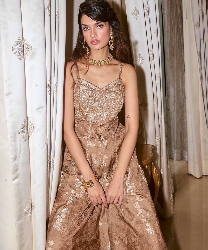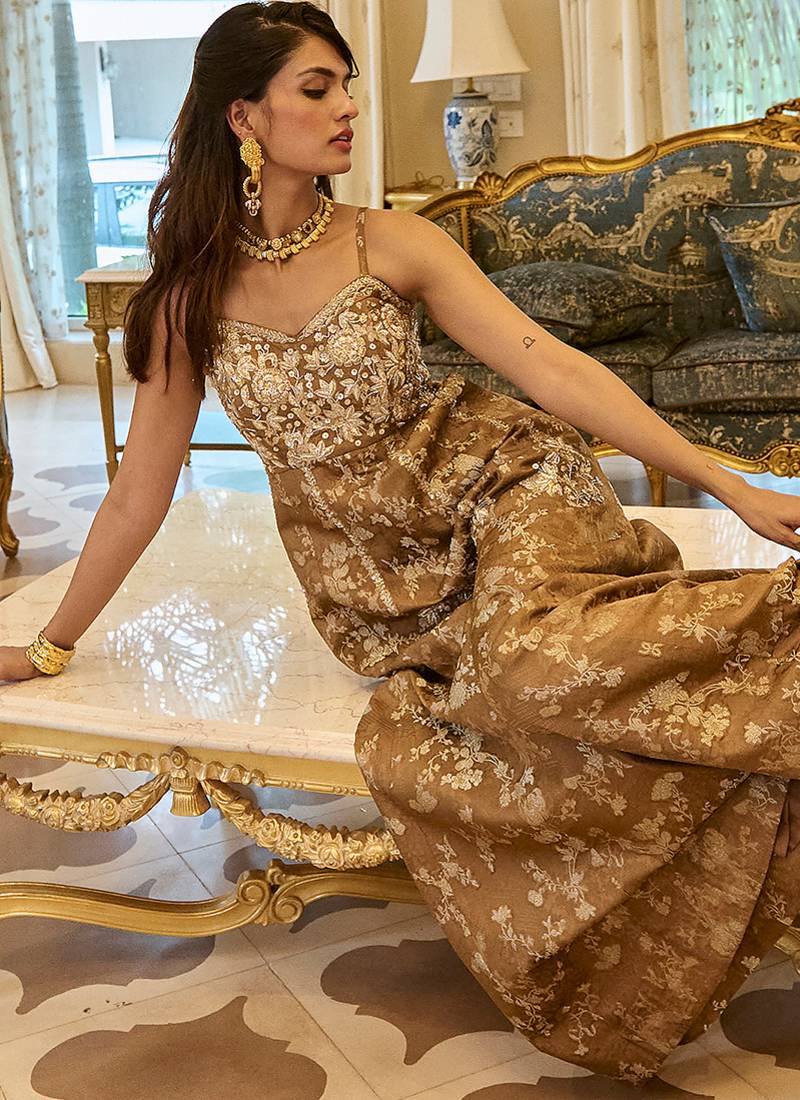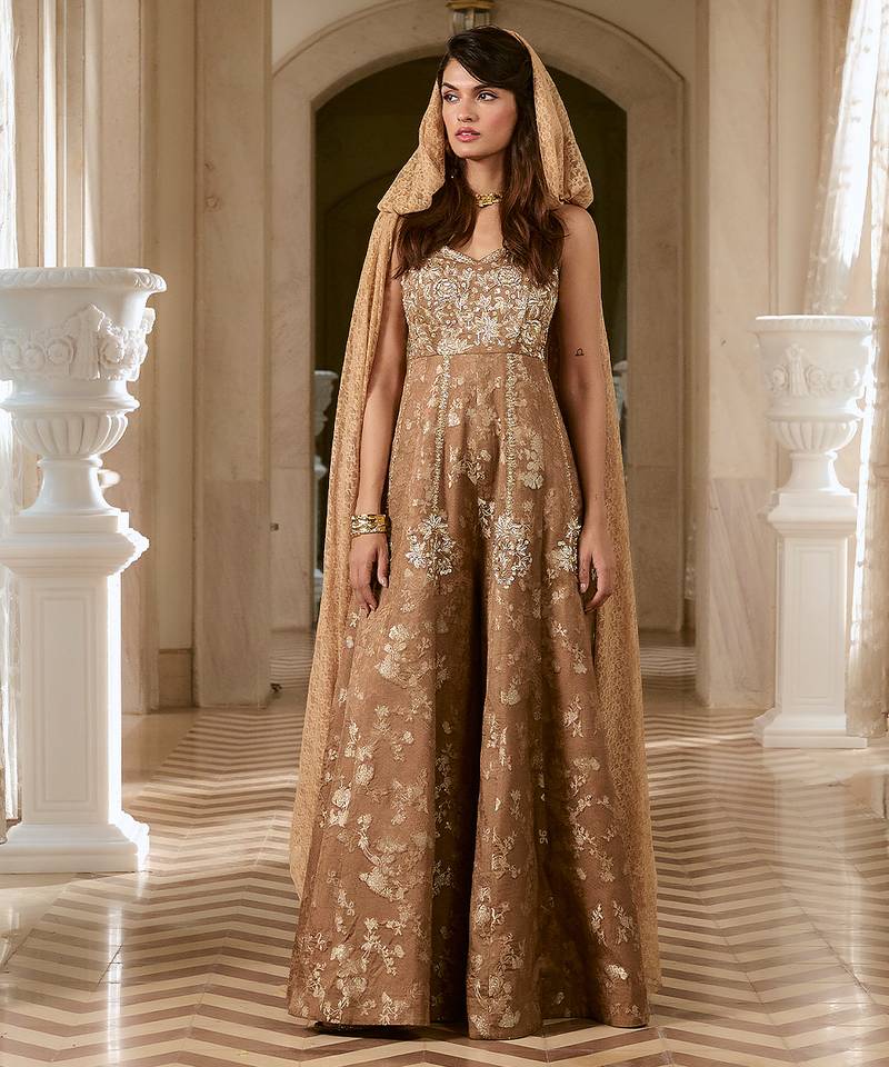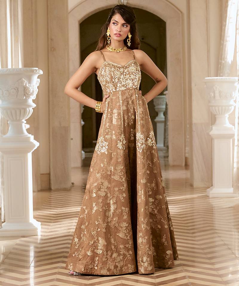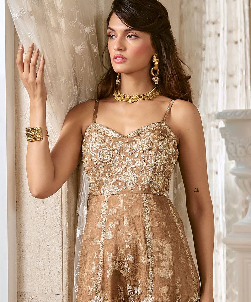 Product Description | A Rich Brown Jumpsuit Crafted In Lustrous Silver Jacquard, Featuring A Sleeveless Silhouette That Exudes Modern Sophistication. The Front Yoke Is Fully Adorned With Intricate Zardozi Hand Embroidery, Which Gracefully Extends Below The Yoke, Adding Depth And Elegance To The Ensemble.