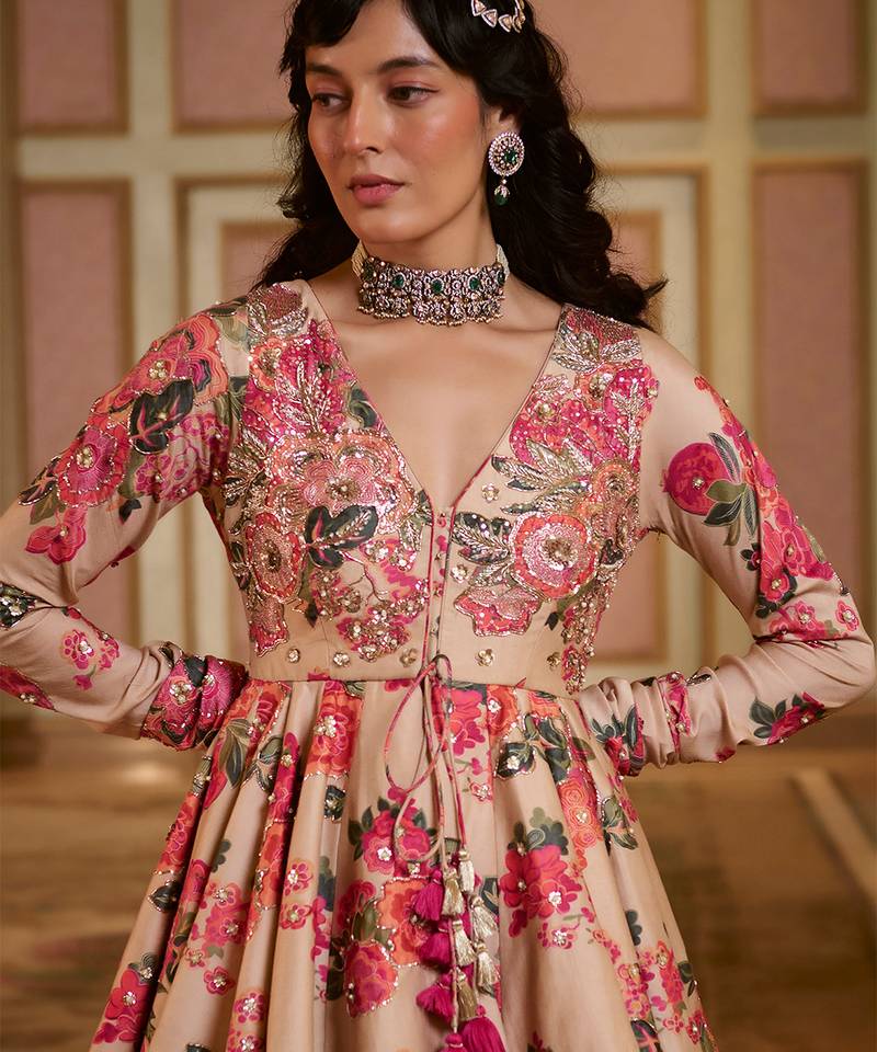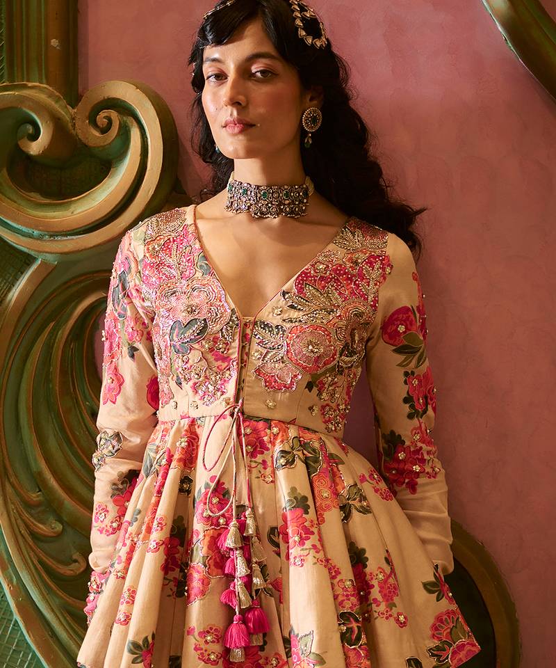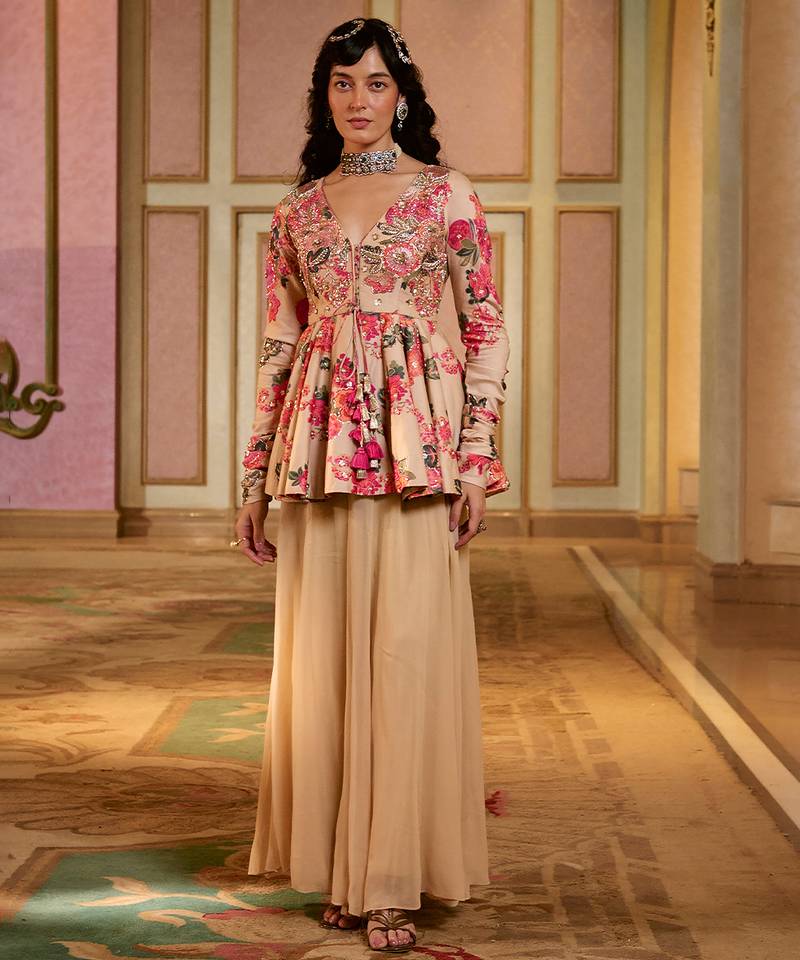 Product Description | Inspired By Blooming Florals, This Modern Peplum Set Features Our Signature Silhouette In Soft Pink And Orange Floral Prints. The Yoke And Sleeves Are Adorned With Zardozi Hand Embroidery, Sequins, And Tassel Detailing, Paired With Solid Palazzos For A Balanced, Elegant Look.