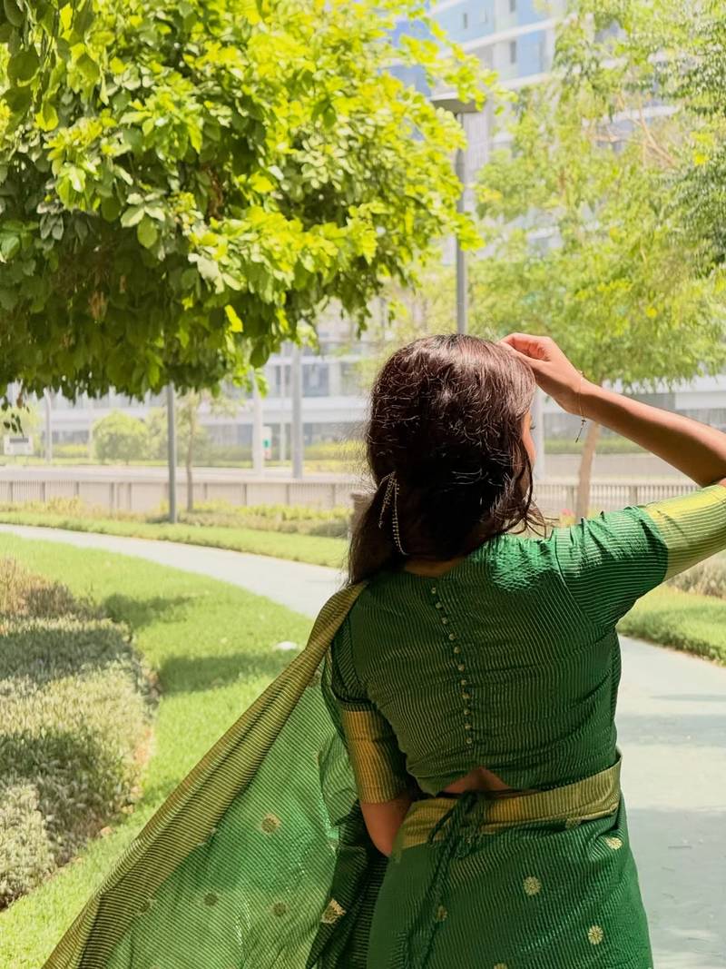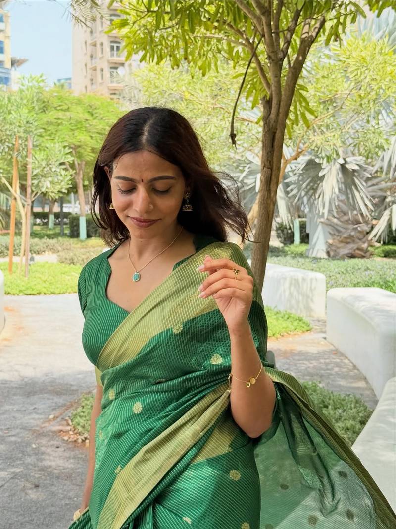 | • | Saree | : | Color- Green / Fabric- Faux Banarasi Silk |