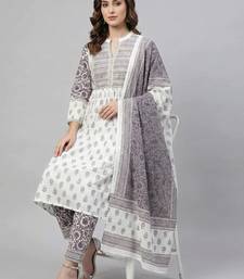 Women white cotton printed kurta pant dupatta set with hand work and lace