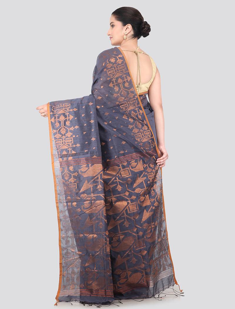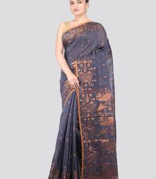 Grey handloom cotton bleand saree with blouse piece