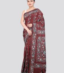 Maroon handloom silk embroidered katha stitch work saree with blouse piece