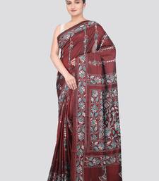 Maroon handloom silk embroidered katha stitch work saree with blouse piece