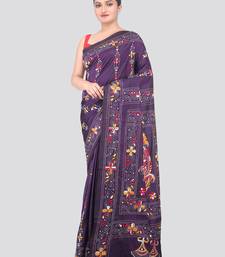 Purple handloom silk embroidered katha stitch work saree with blouse piece
