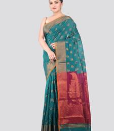Sea green handloom cotton bleand saree with blouse piece