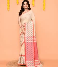 Beige cotton handloom saree with tassels & contrast border