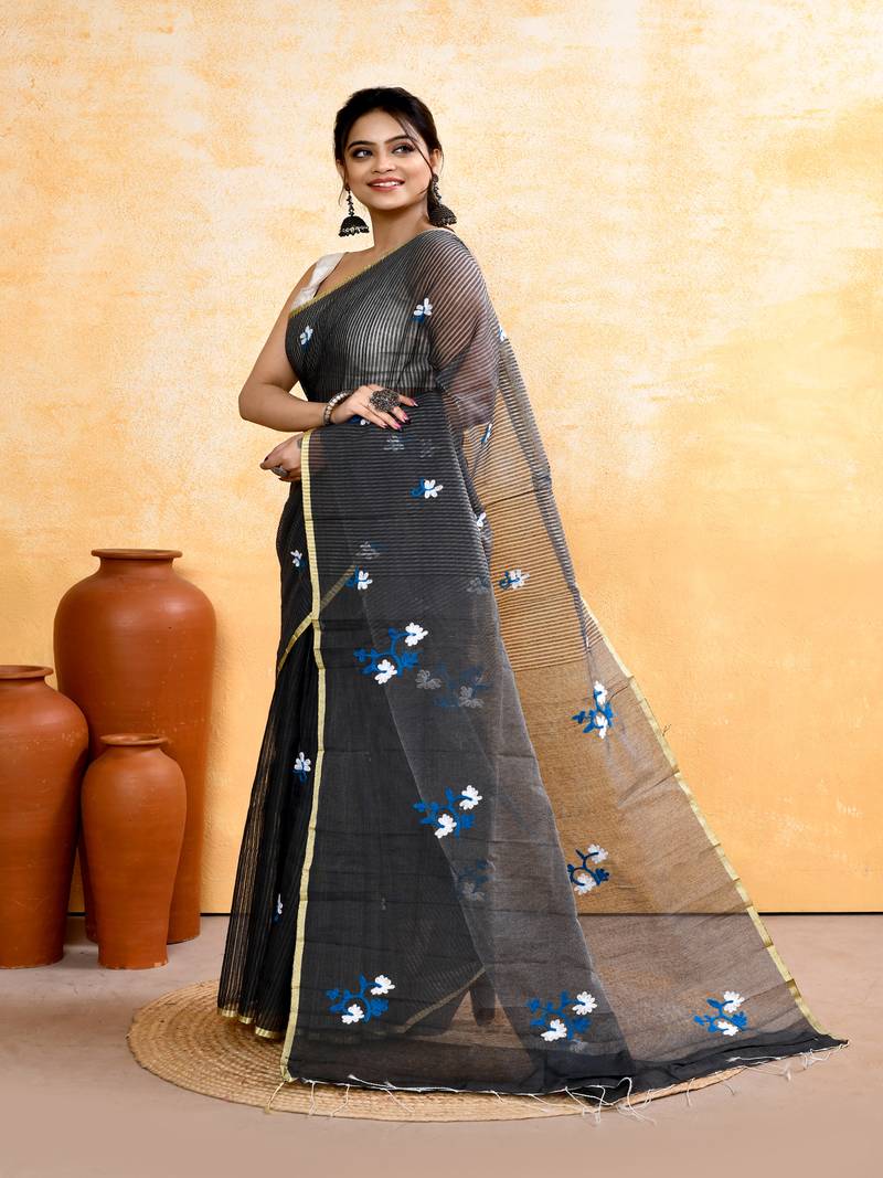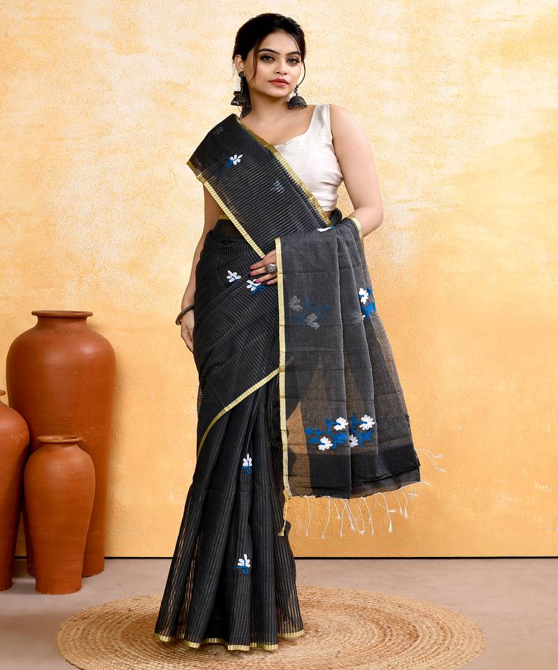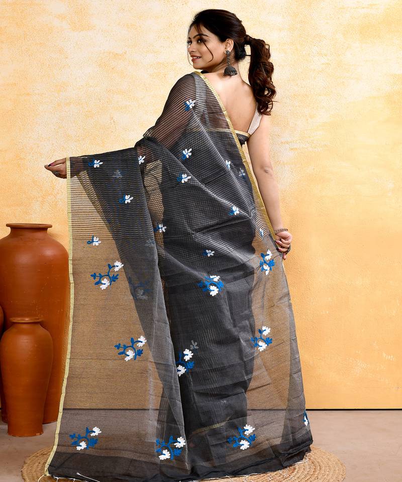 Women's grey embellished cotton blend embroidery saree