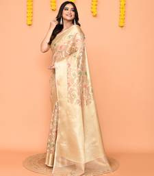 Beige banarasi silk saree with handwoven zari border