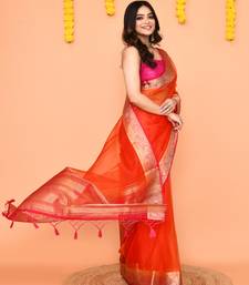 Orange organza silk saree with handwoven zari border