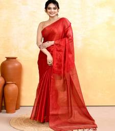 Red dual tone organic tissue saree with blouse piece