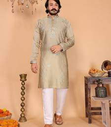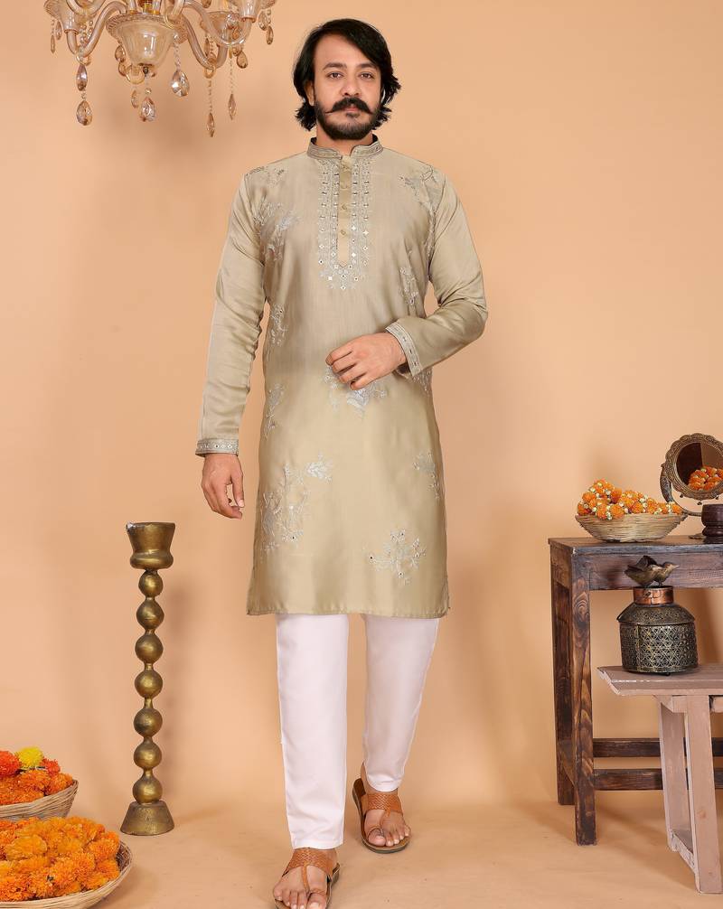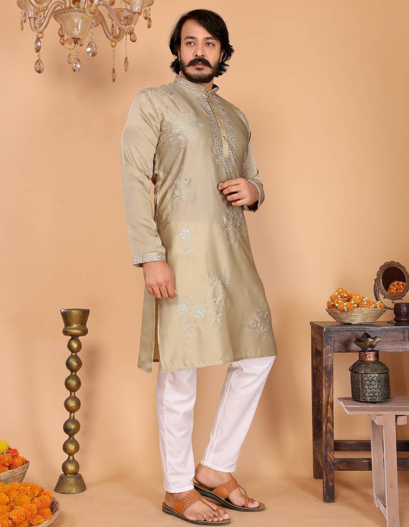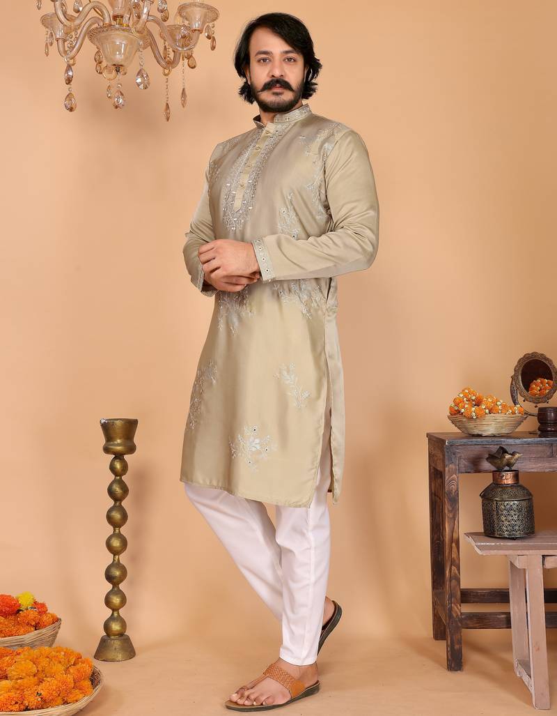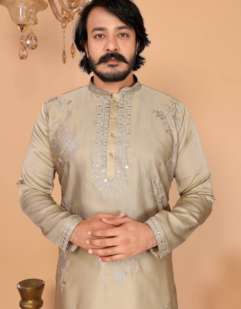 | Product Name | Beige Sequins Embroidered Viscose Silk Band Collar Men’s Designer Kurta Pyjama Set | |