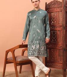 | Product Description | Elegant Dusty Teal Silk Kurta Adorned With Exquisite Thread And Zari Embroidery Featuring Floral And Bird Motifs