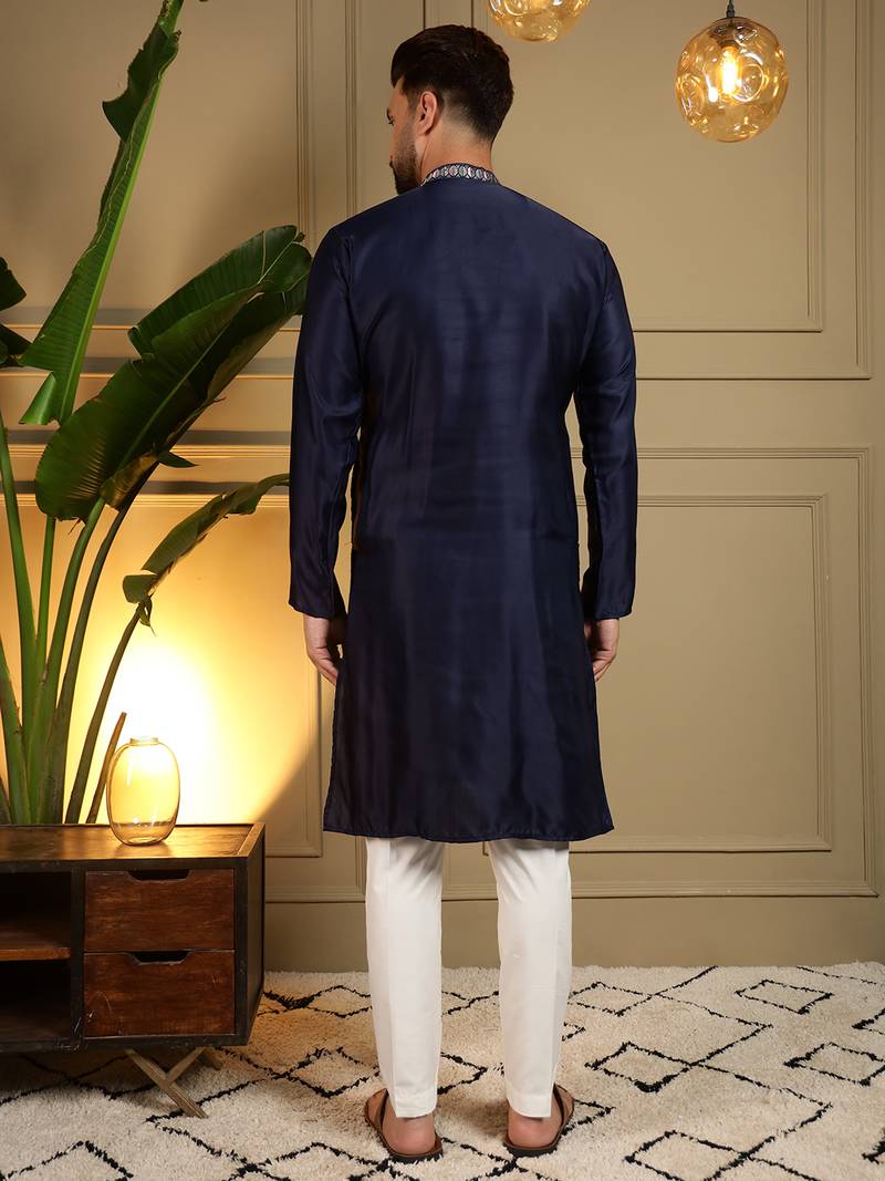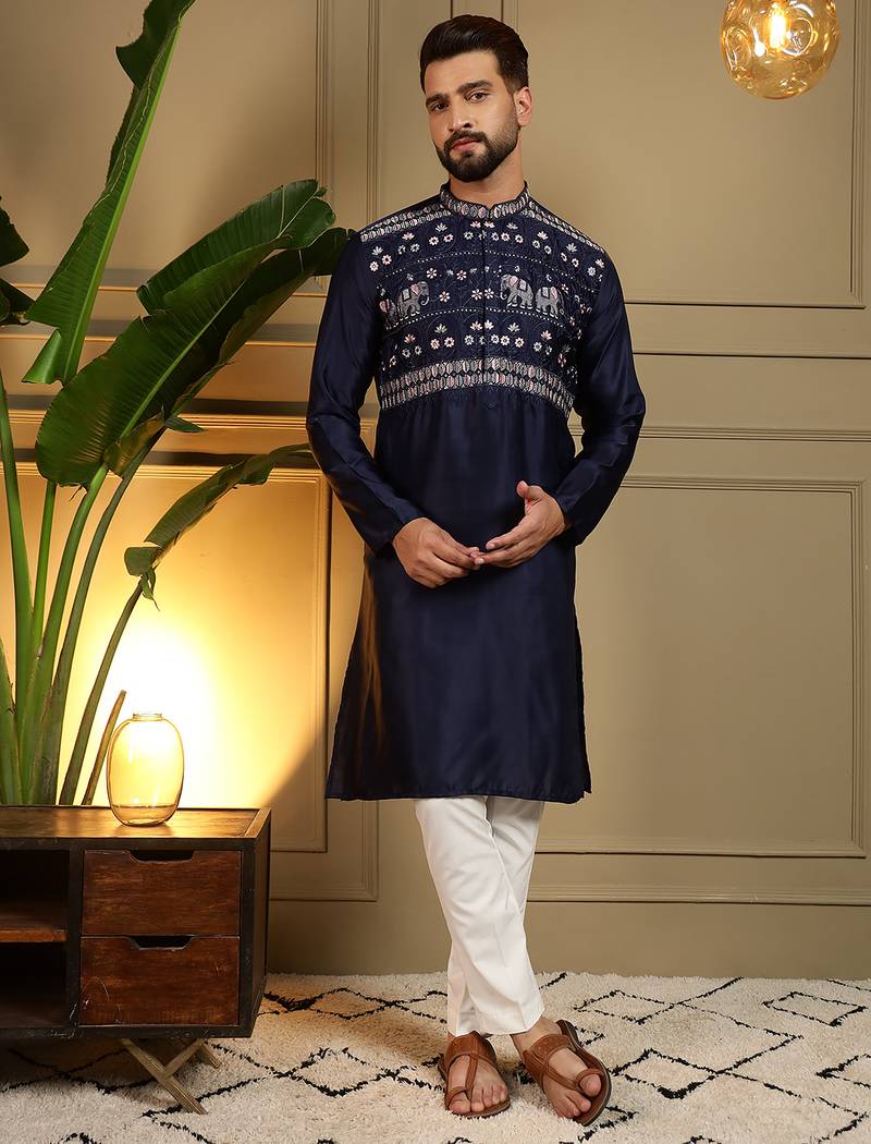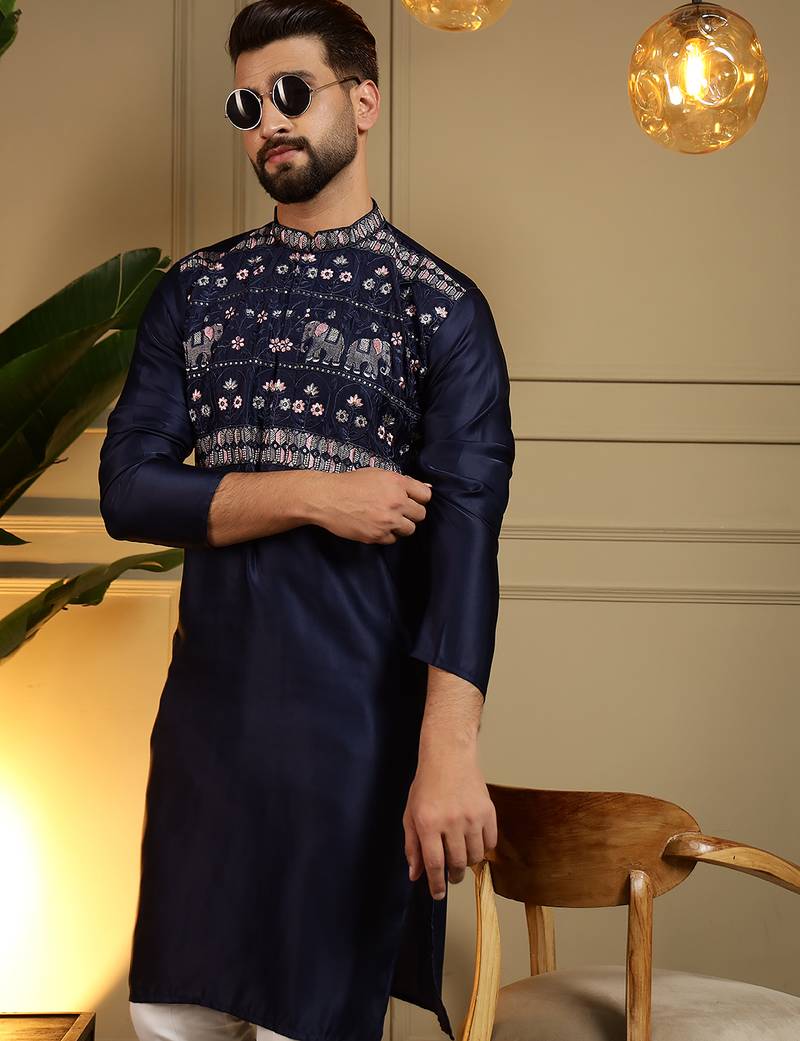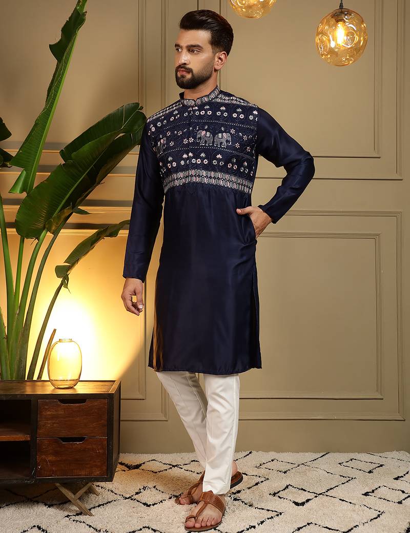 | Product Name | Navy Blue Embroidered Viscose Silk Kurta Pyjama Set For Men With Elephant Motifs Band Collar Design | |