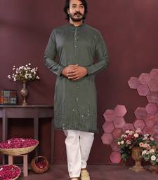 Olive green mirror work cotton blend straight kurta for men | embroidered festive wear trendy
