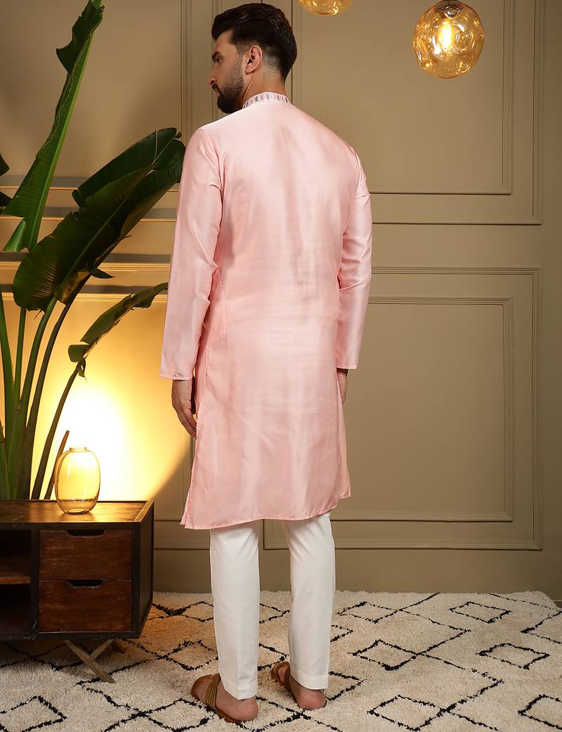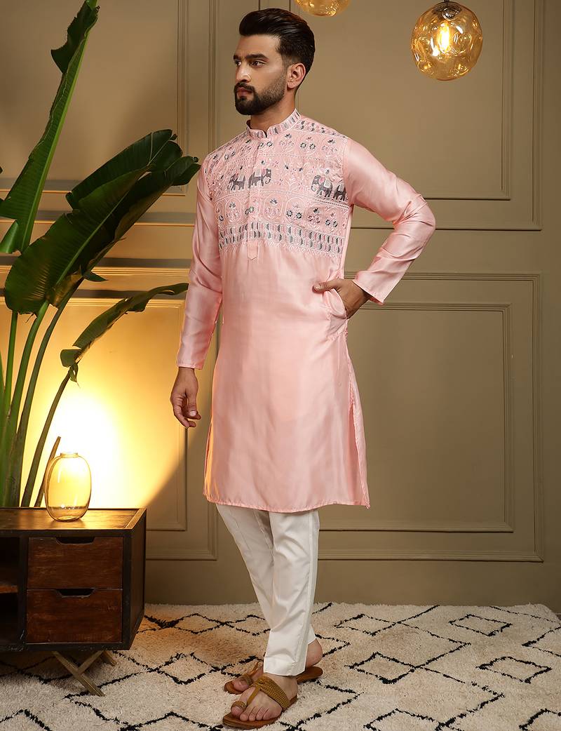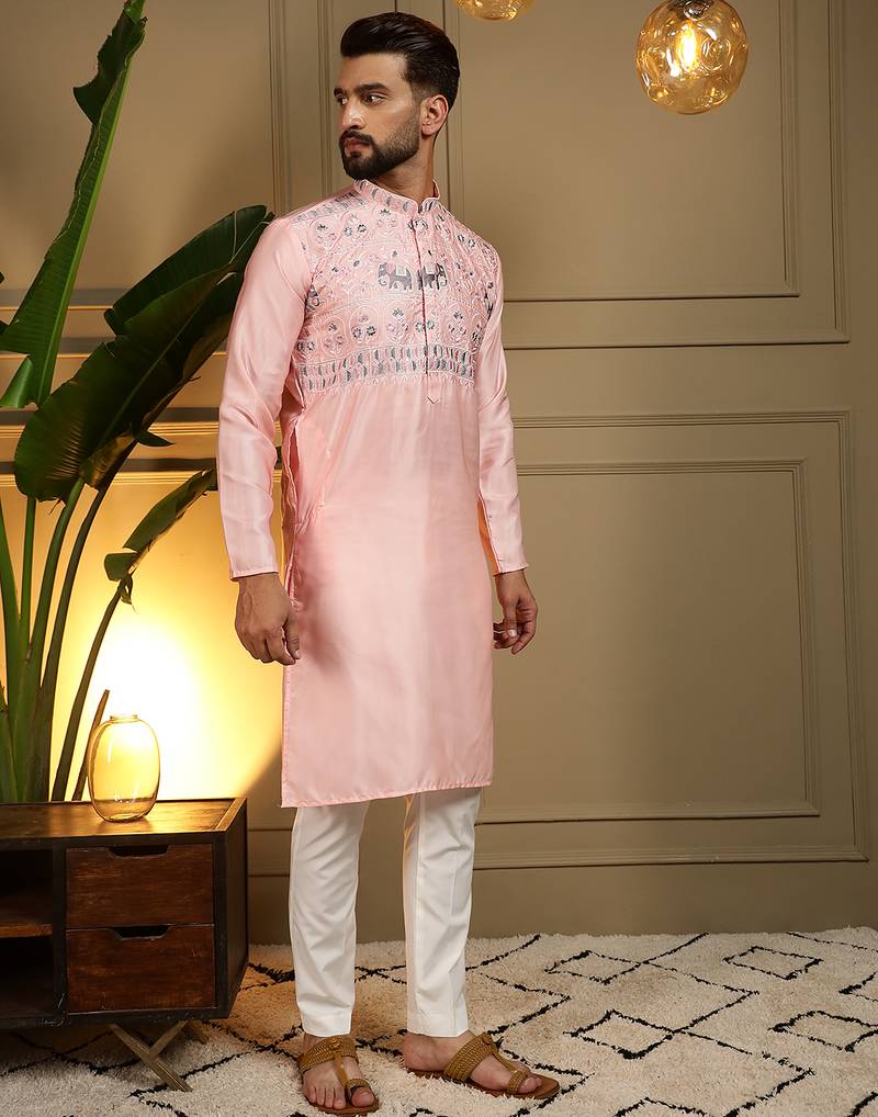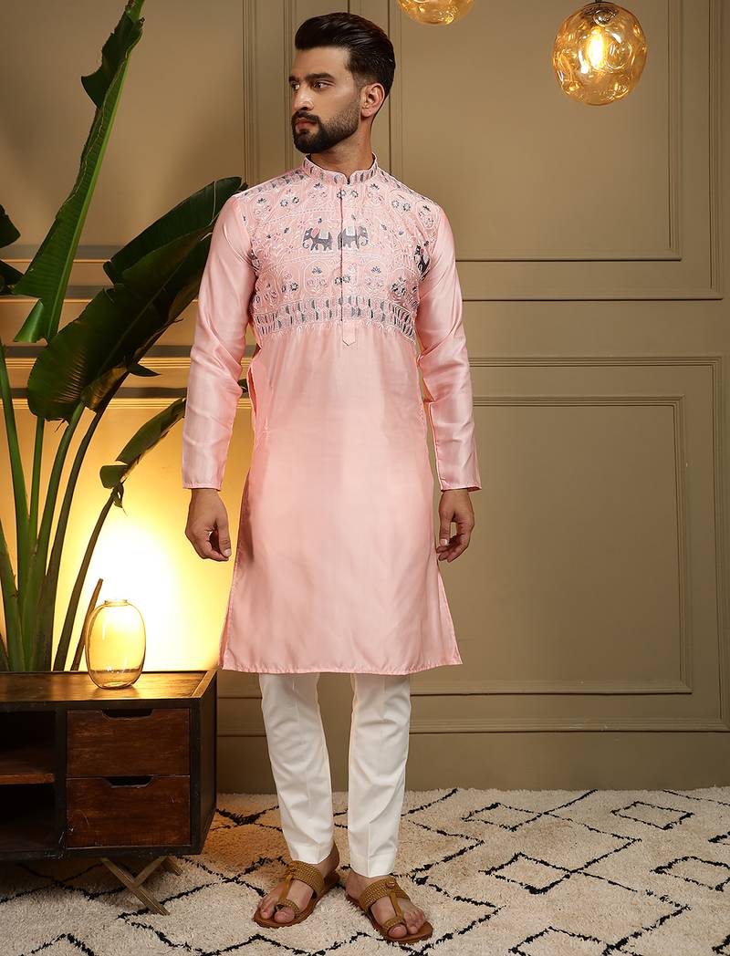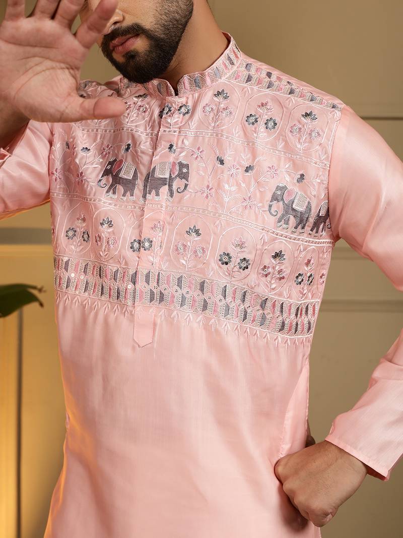 Peach viscose silk elephant embroidered kurta pyjama set for men