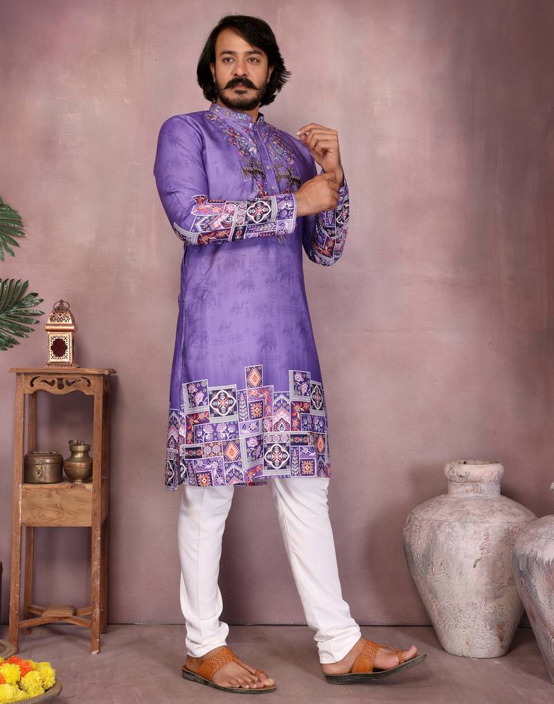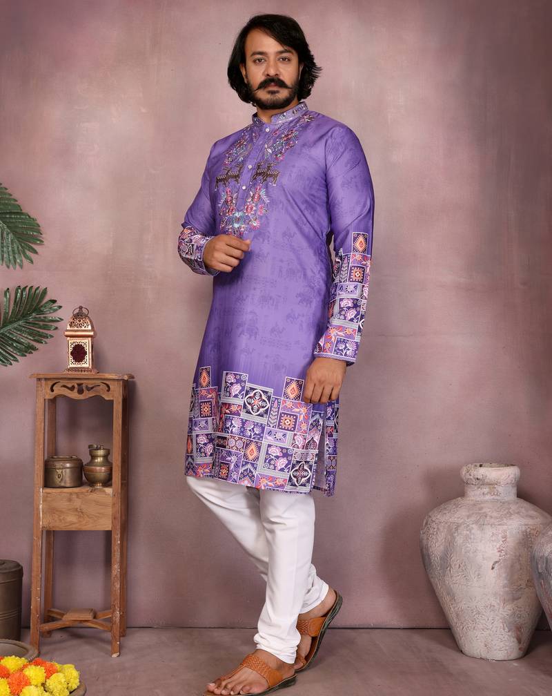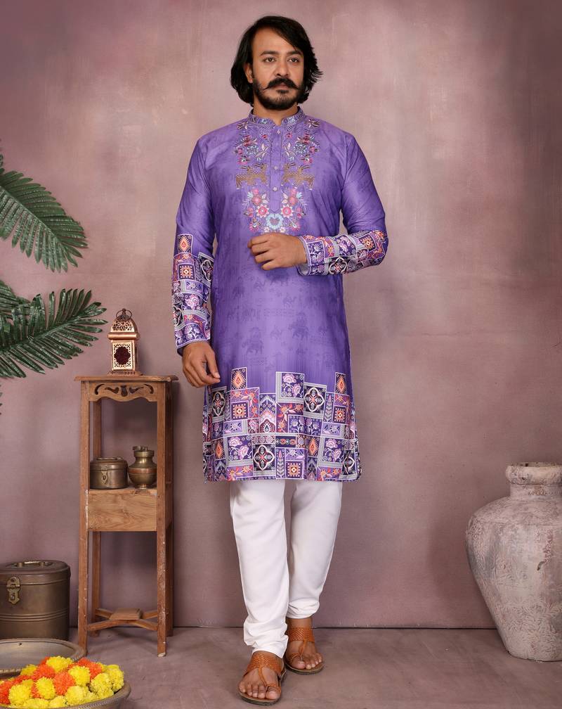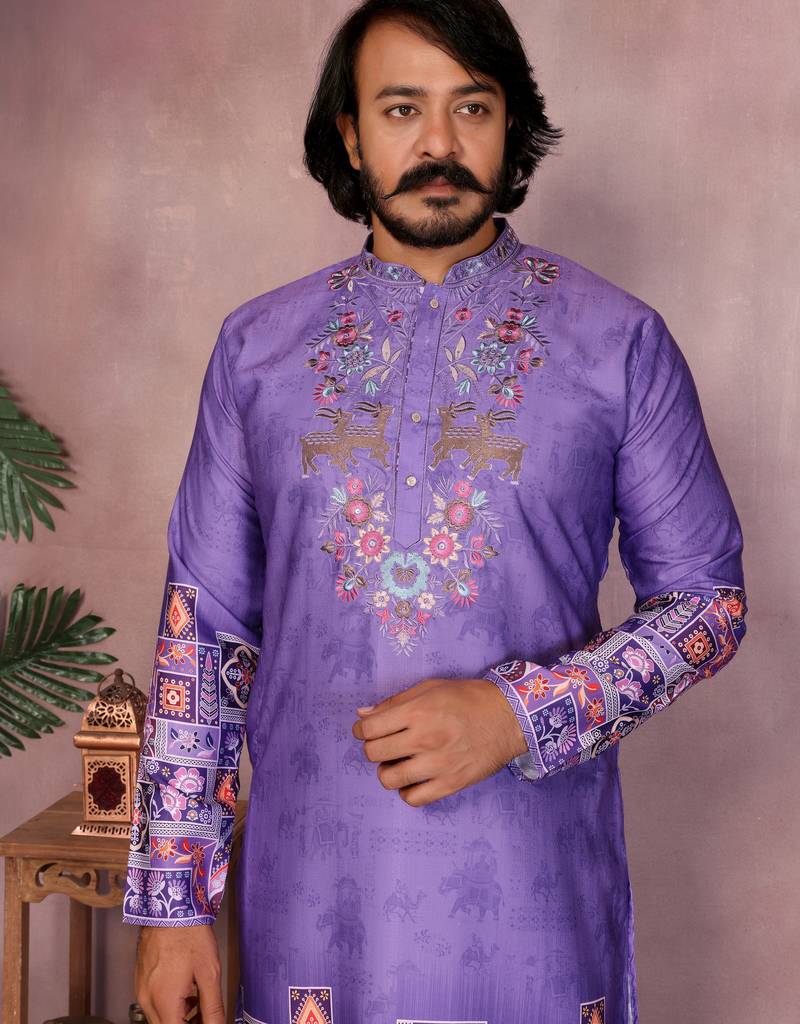 | Product Name | Purple Khadi Cotton Kurta Pyjama For Men | Designer Sequence & Neck Embroidery Set | Festive Wear | |