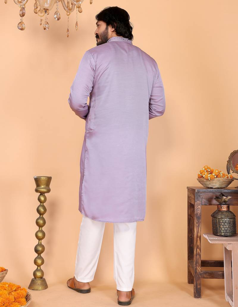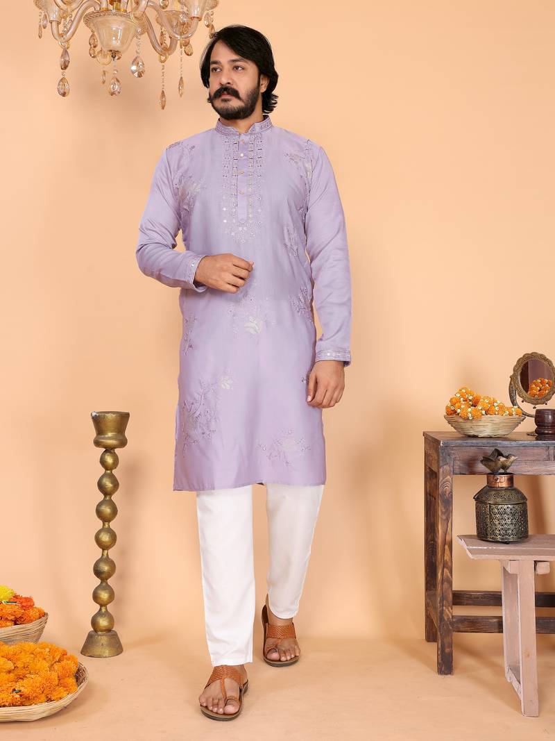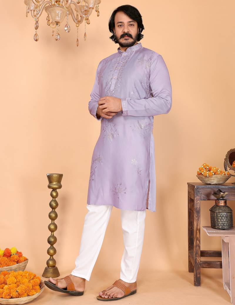 | Product Description | Soft Viscose Silk Fabric With Elegant Floral Thread & Sequin Embroidery For A Refined Festive Look. Band Collar Neck Offers A Sharp, Modern Silhouette Suitable For Weddings, Parties & Festivals. Comes With A Comfortable Cotton Blend Pyjama, Perfect For Long Functions And Celebrations. Pastel Purple/Lilac Shade, Trending Heavily For 2025 Men’s Ethnic Wear. Ideal For Wedding Events, Haldi, Sangeet, Puja, Festive Gatherings & Special Occasions.