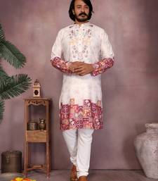 White khadi embroidered & printed designer kurta pyjama set for men festival & wedding wear
