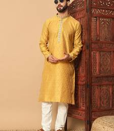 | Product Name | Yellow Zari Woven Jacquard Band Collar Kurta Pajama | |