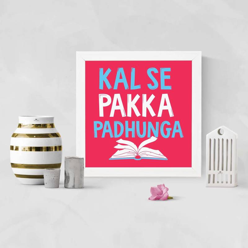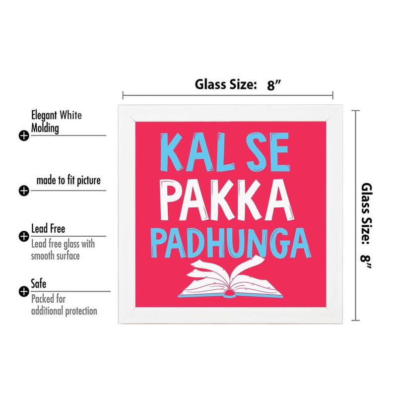 Kal se pakka padhunga humour white framed wall hanging art print for office home reading room ( 8x8 ) inch