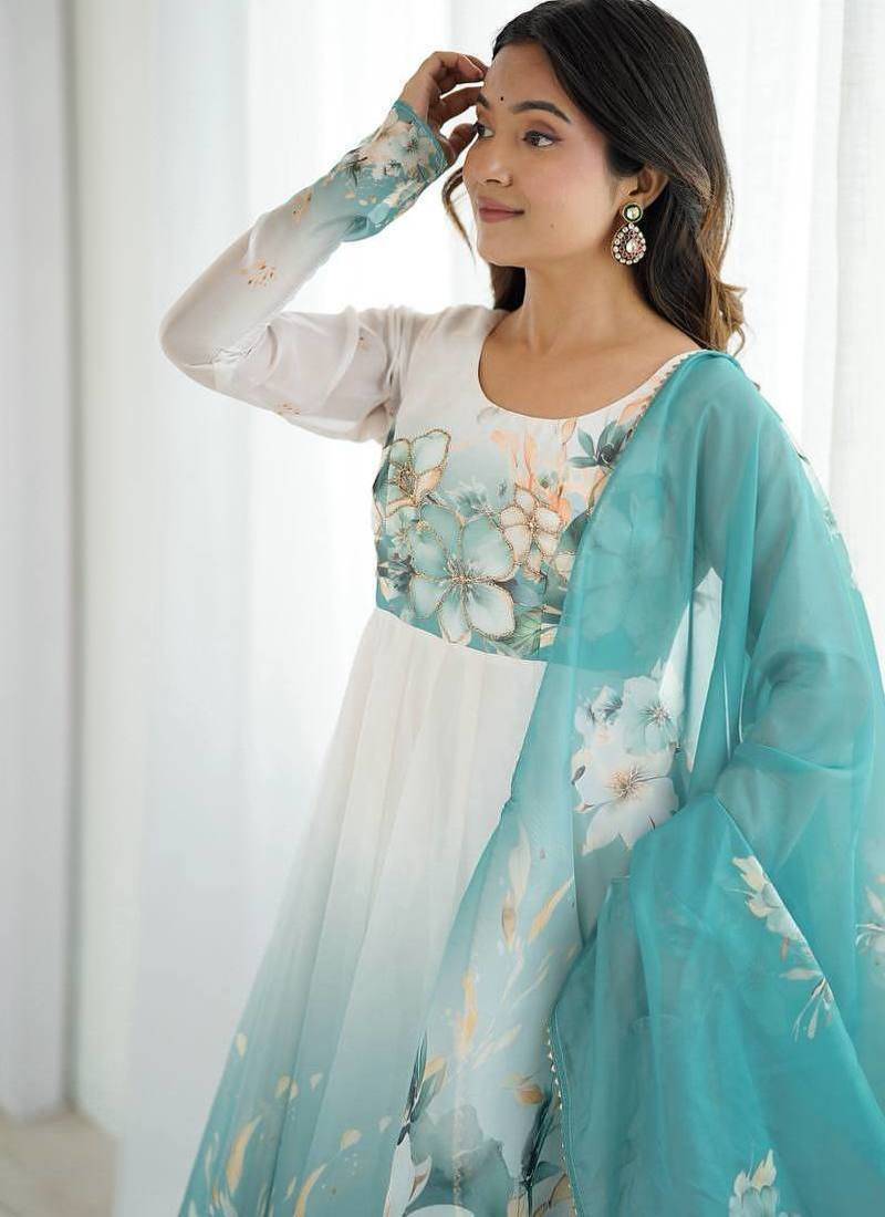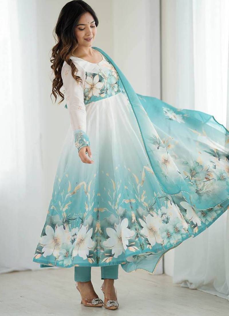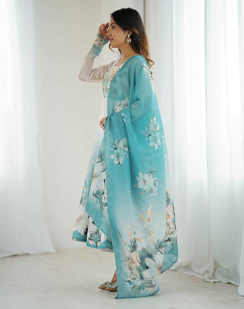 | Product Name | Aqua Blue Color Flower Printed & Handwork Orgenza Silk Anarkali Set | |