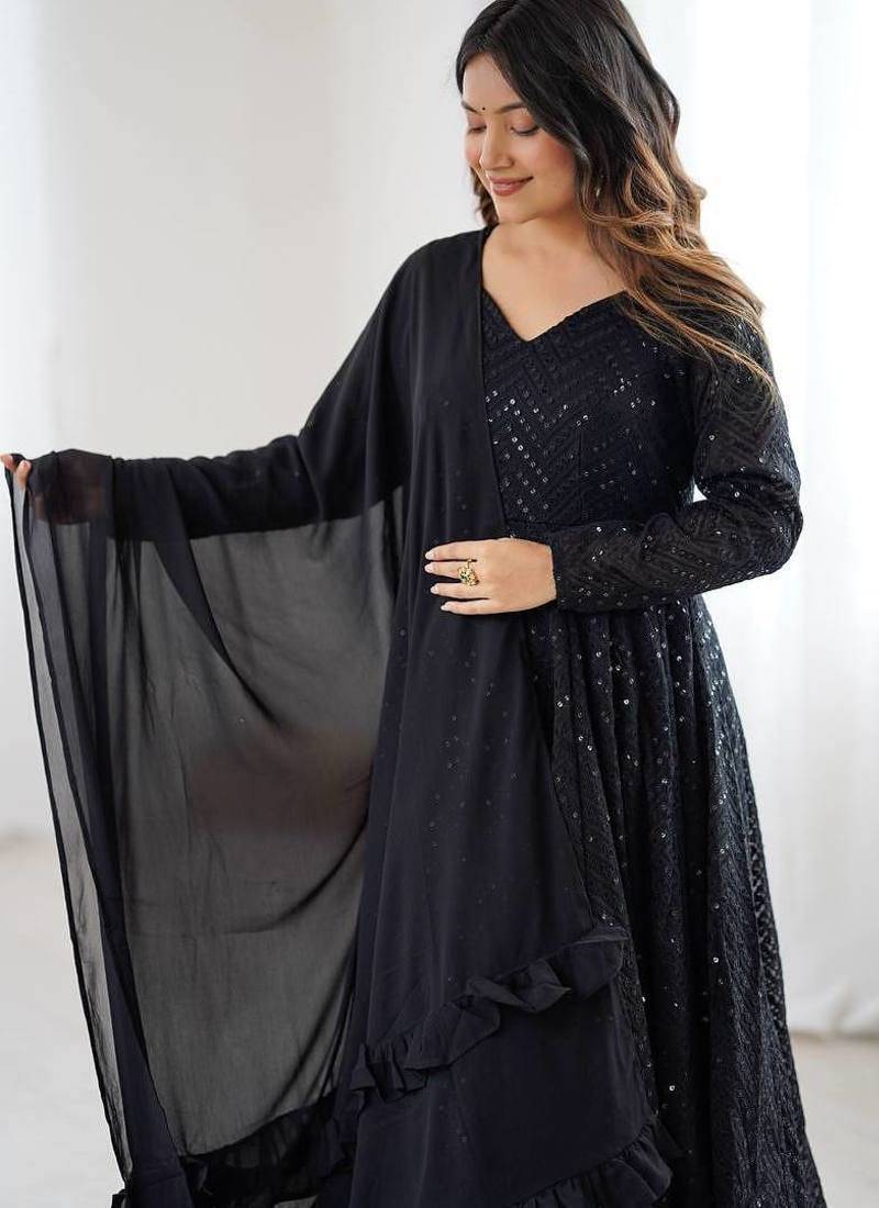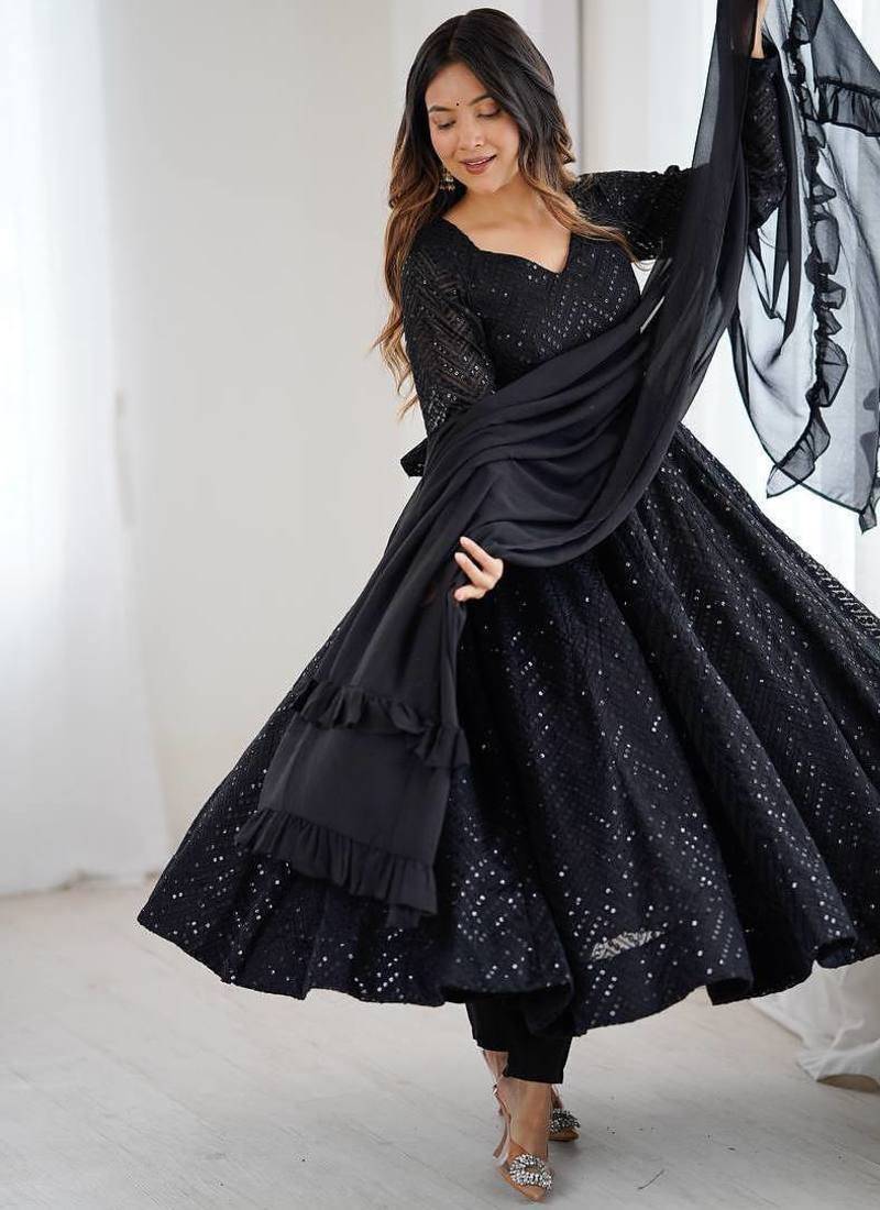 | Product Name | Black Color Lucknowi Sequince Thread Work Faux Georgette Anarkali Set | |